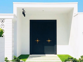 Ride the blue wave with this mid-century door! Settled in Palm Springs, the balance of white exteriors and azure perfectly complement this home’s minimalist entryway, as well as the Southern California skies!