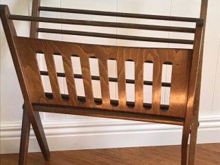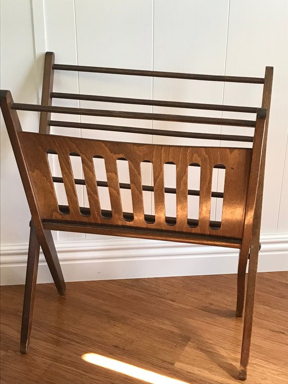 Vintage Midcentury Modern Romania Magazine Folding Wood Rack in Walnut, $55.95.