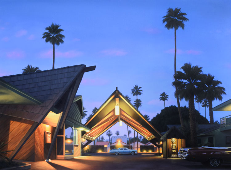DH: Currently I’m up to my knees working on paintings for my next major exhibit, “Tiki Modern.” This show will focus on how the Mid Century Modernism I typically paint extended into the tiki world back in the 1940s through 1960s. It’s by no means the definitive tiki show, but mainly tiki architecture and design that have played a part in my life growing up in Southern California.
