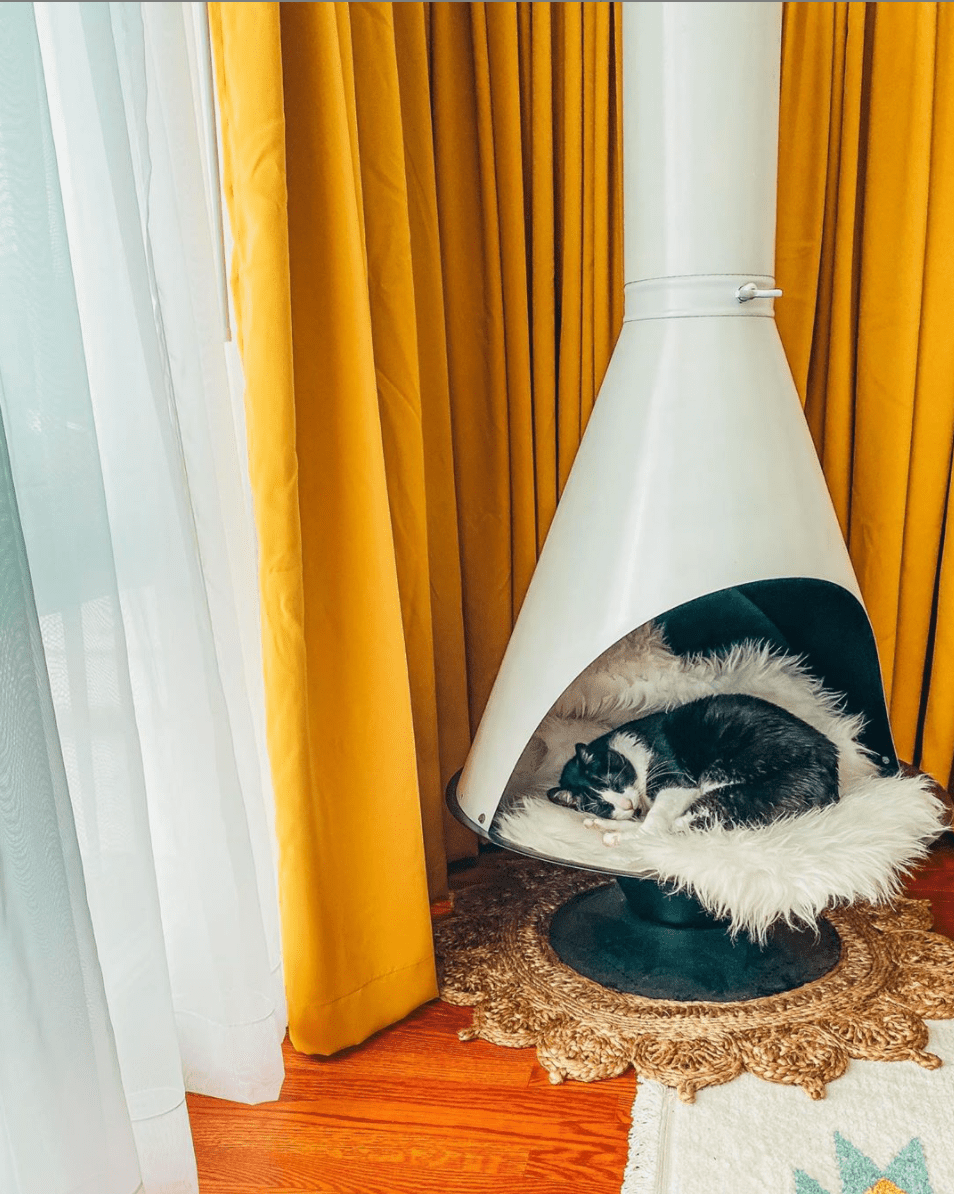 This matte black fireplace fits effortlessly into this atomic living room. The dogs don’t seem to mind it too much either.