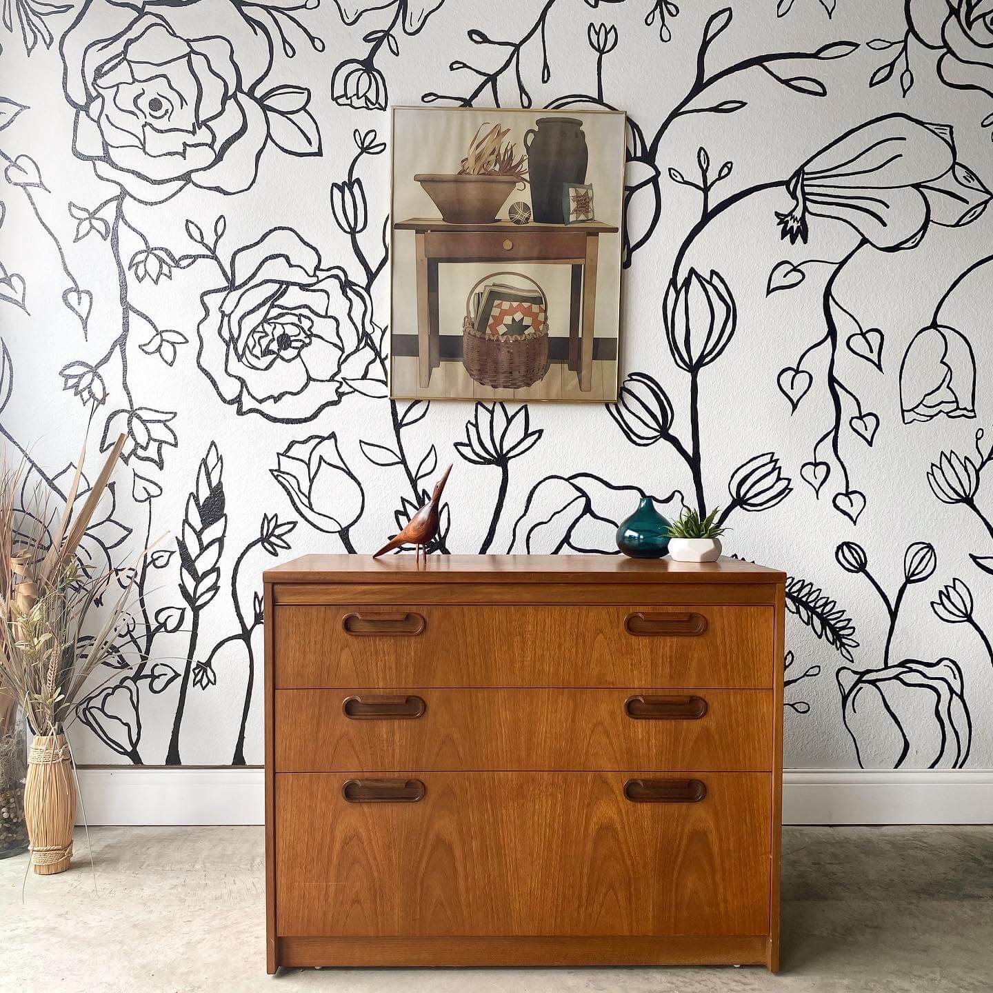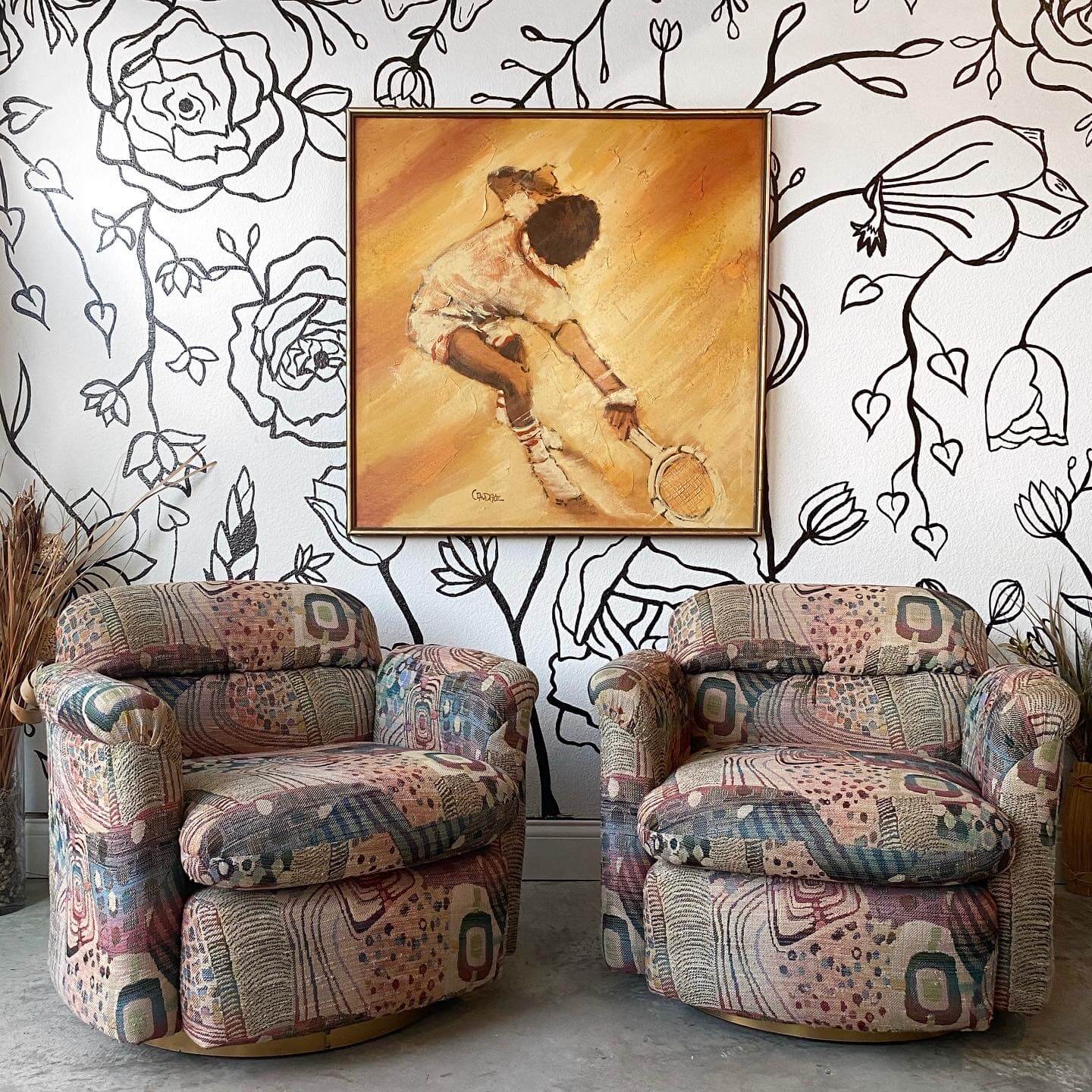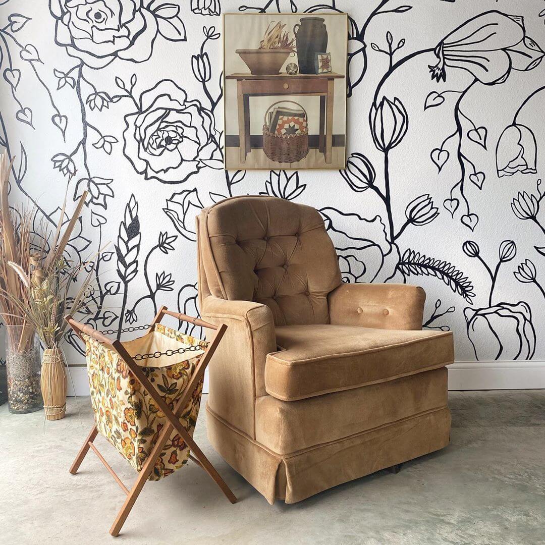 Mal: I actually drew the design onto the wall freehand. We wanted something for Curated Haus that would stand out and pop when our customers are scrolling on Instagram. It’s become so recognizable that we actually have customers reach out if users try to repost our photos. They see the backdrop and know instantly that it’s us! I even had to post a tutorial about the wall to our Instagram Highlights because so many customers want to know how I did it!