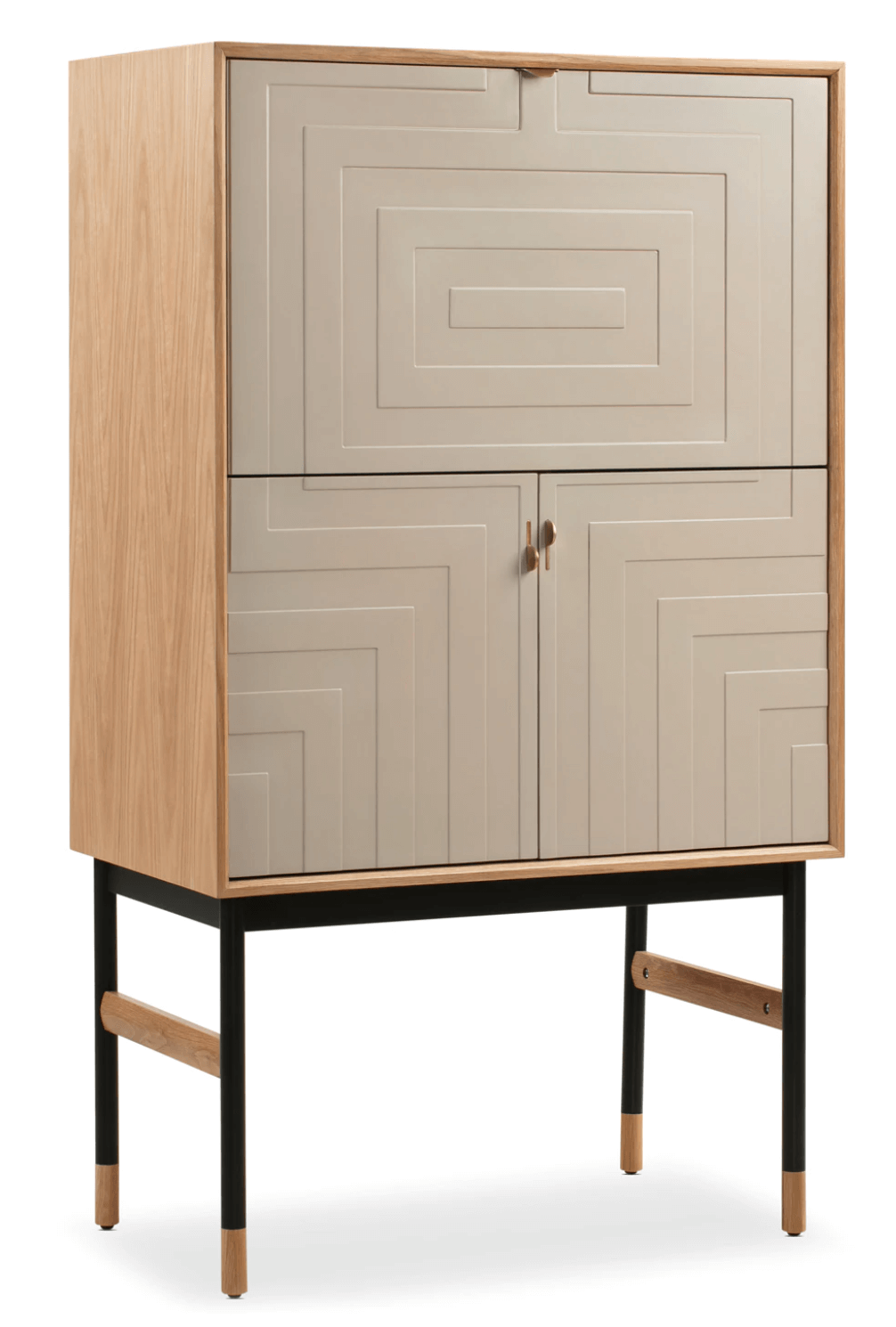 Need a space to store your glasses and bottles? This Urbane Bar Cabinet‘s top cabinet doubles as a bar top with a mirror for retro flair.