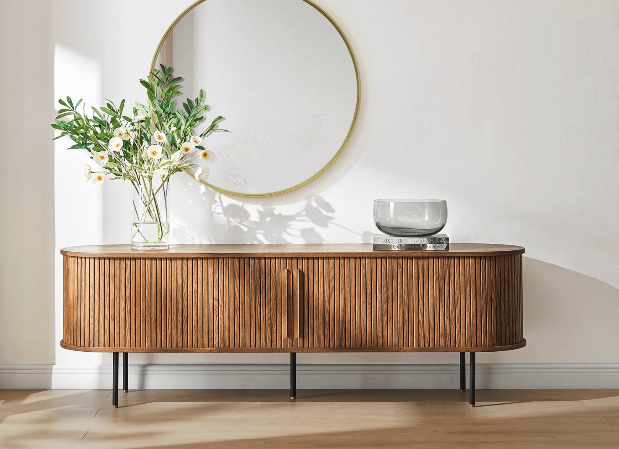 If you’re looking for simple and clean storage, the Lenia Sideboard is a sleek option with three drawers and two cabinet doors.