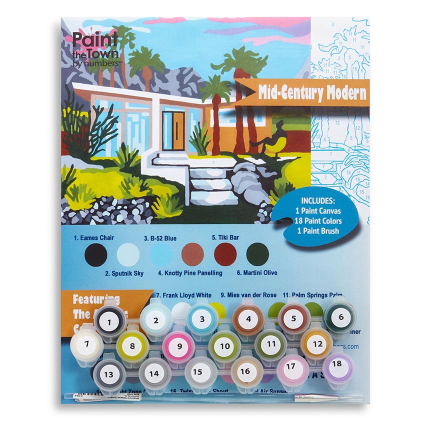 How do we love thee, paint by number set, let us count the ways: 1) the nostalgic charm of a real life paint-by-number kit available today. 2) The amazing butterfly roof house complete with lady in repose in an egg lounge chair. 3) The names of the paint colors! Paint The Town By Numbers really thought of everything.