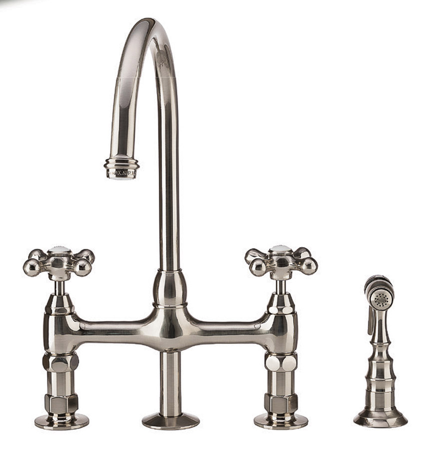 Take a gander at this gooseneck faucet and fall in love. Sporting a chrome sheen and vintage-handle design, this piece offers an intricate silhouette that will leave you stunned. Gooseneck Bridge-Style Kitchen Faucet, $320.