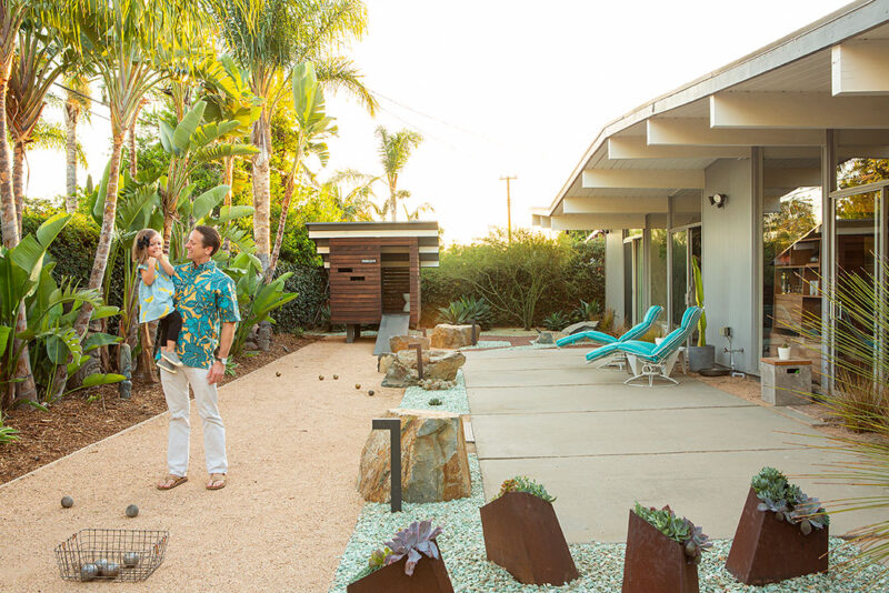 Give your kiddos a place to play without having to be too precious about keeping everything to adult levels of cleanliness. We love this one from the Sigband’s fantastic backyard. We also recommend Eichler Siding for period authentic siding to make the shed at home with your Mid Century Modern aesthetic.