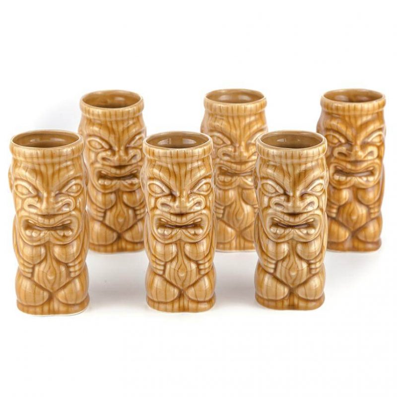 This set of six mid century vintage tiki mugs will bring a refreshing touch of tropical vibes to your next gathering. These 13.5 oz ceramic glazed glasses have a wood grain look and measure 6 1/8″ tall and 3 1/8″ wide.