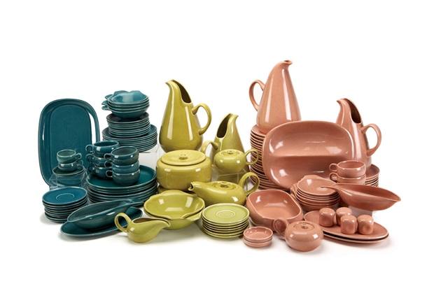 Produced by the Steubenville Pottery Company and introduced in 1939, Russel Wright’s American Modern dinnerware had a fresh new look that remained wildly popular throughout the midcentury. Created in several different colors, the American Modern pieces allowed for mixing and matching. The collection is still made today, exclusively by Bauer Pottery.