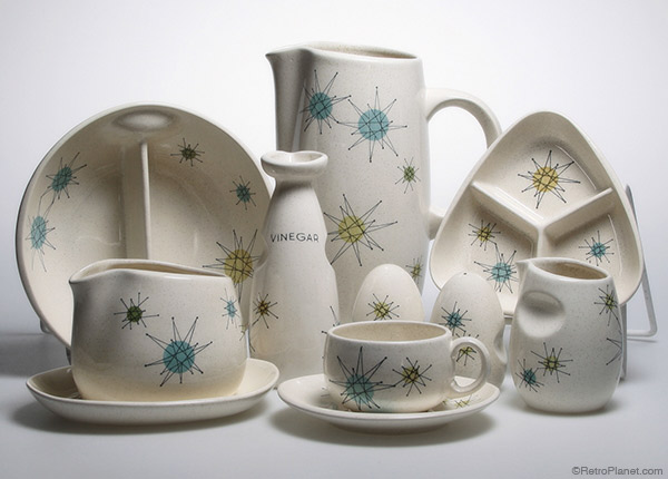 Gladding-McBean & Co. debuted its Franciscan Pottery line in 1934. The Southern California company eventually changed their name to Franciscan Ware and launched the Starburst pattern in the mid 1950’s. Perfect for the atomic age, the pieces include teacups, serving dishes, salt and pepper shakers, and sectioned plates.