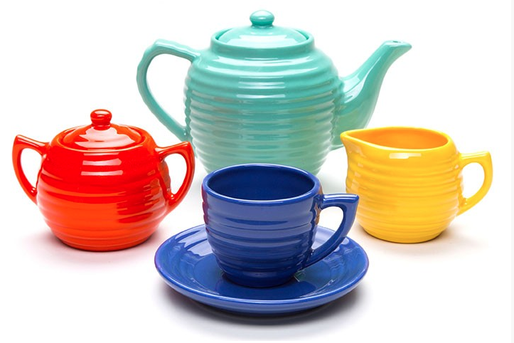 A huge name in vintage pottery dating back to the late 1800’s, Bauer continually met desires of the changing times. The Ringware collection was introduced during the 1930’s while the the Al Fresco, La Linda, and Monterey Moderne styles were wildly popular during the midcentury. Seen here is a modern Ringware tea set from Bauer Pottery.