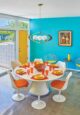 This Palm Springs dining room takes a different approach, embracing vivid desert color with gusto. The scene is set for a lively MCM holiday at this Tulip table with orange placemats, yellow ceramic plates, textured orange glasses and wood-handled cutlery.