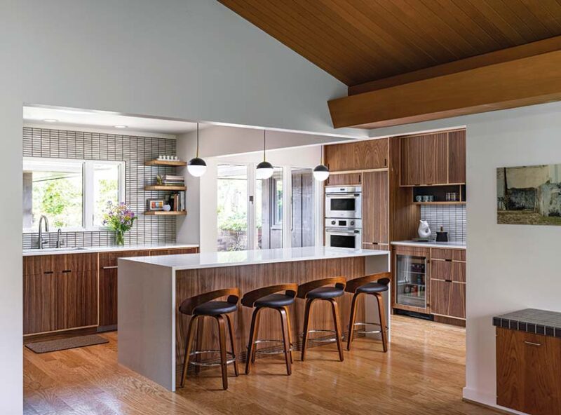 “A major decision was to work with Kerf Design cabinetry to achieve a Mid Century Modern kitchen with a unique visual style and customization opportunities to meet our clients’ functional needs,” Carly says. “They especially wanted walnut cabinets without hardware or embellishment on the doors.”
