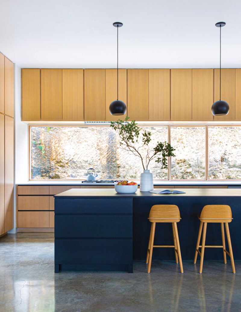 When interior designer Sarah Stacey took on this remodel for a busy family of five in Northwest Austin, her key directive was to turn this ’70s era space into a clean and modern respite that was filled with natural colors, lots of wood with black accents and absolutely no marble. Which was perfect because it’s hard to compete with the magnificent limestone rock wall, which dominates the view right outside the kitchen.