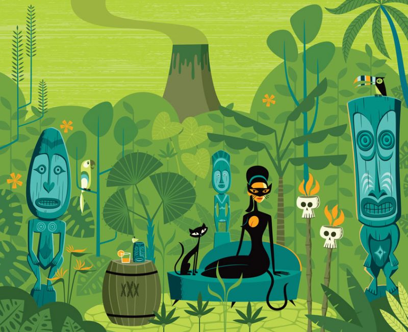 There’s something decidedly rock-and-roll about Josh Agle’s artwork. Better known as Shag, he creates pieces that are a mid century fantasy come to life, where all the world’s a swinging cocktail party and painfully-cool people dance and lounge poolside. You can almost hear the bossa nova or the early sounds of the Beatles playing in the background.