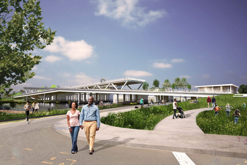 Repurposing a dilapidated railway trestle as the site for a new park connecting Washington D.C.’s socially and economically disparate Ward 6 and Ward 8 on either side of the Anacostia River, the 11th Street Bridge project has been compared to New York’s High Line park for its vision to reclaim and reuse sites decimated by urban renewal. As Director of Design for the Anacostia Waterfront Corporation, Griffin was one of the jurors that awarded architecture firms OMA and Olin the winning design in the 11th street Bridge Park design competition. Traces of MCM influence are expressed in the split-level structure as well as the continuity between indoor and outdoor space among green garden spaces, a waterfall feature, an environmental learning center, a performance stage and a café. Griffin’s values driven approach is also evident in the project which claims values such as equity and community, as well as delight to guide the design process. At the center of the split-level structure is an iconic “X” shape, imbuing meaning to the park’s original vision to be “an intersection where communities on both sides of the river—which have been socially, economically, and politically disparate—to converge and coexist.”