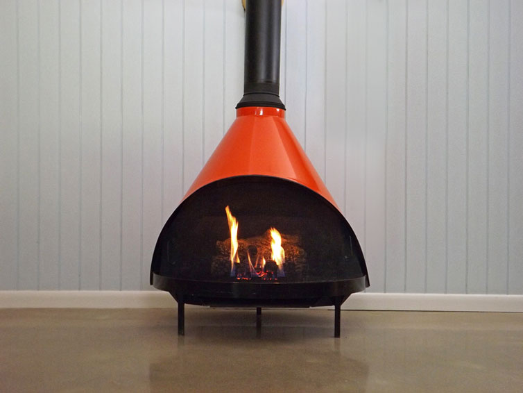 Knowing that someday my wife Tina and I would own our forever midcentury home, we decided to hang on to the stove. Years later while working on the remodel plans for our 1963 midcentury home, it was finally time to bring the stove into the mix. We had the perfect spot for it in our basement and even based the accent wall paint off the stove’s original finish. Not wanting to deal with the mess associated with bringing firewood in the house, we found a set of gas logs that finished the stove off perfectly.
