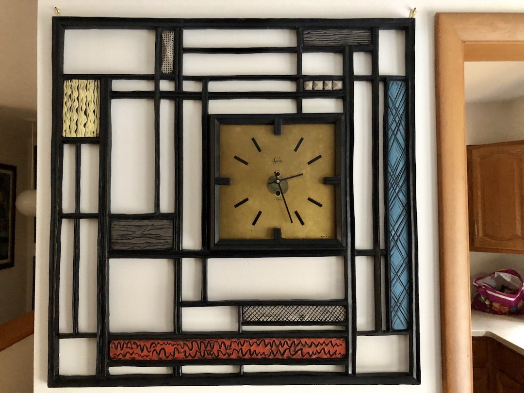 This square clock designed in the 50s is an example of a wood pulp molded design. The geometric design resembles a Mondrian painting. The clock is rare, however, since it was never launched into full production.