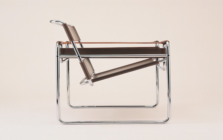 During this time, Breuer began working with tubular steel, inspired by bicycle handlebars. In 1925 he designed a chair that would later be known as the Wassily chair (named for artist Wassily Kandisky, a Bauhaus professor who had a copy of the original in his home), it featured a bent tubular steel frame and seat made from leather straps. It was soon mass-produced and versions are produced by Knoll today.