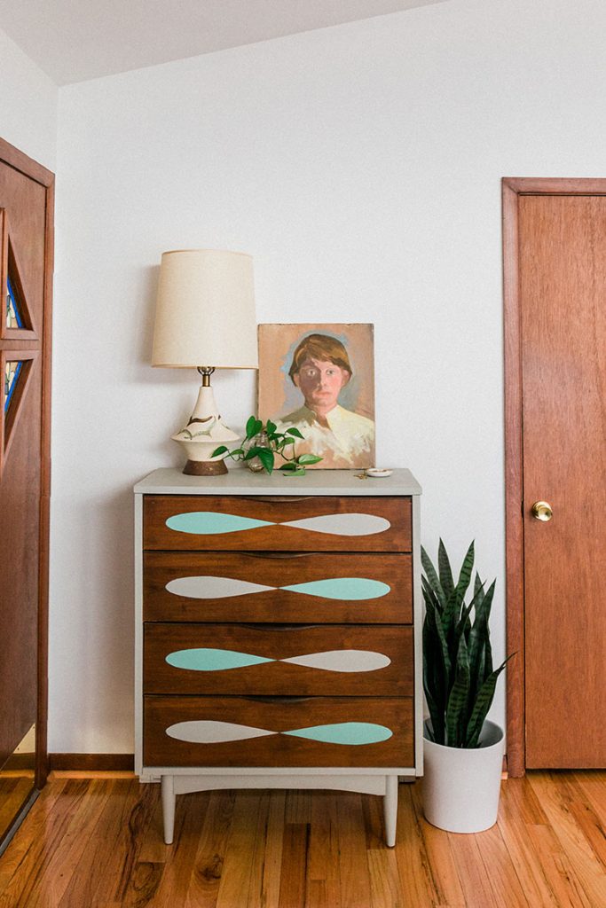 Carrie artfully and playfully weaves vintage items with new. She explains her approach, saying, “Our home budget is tight. We don’t have a ton of money to spend on authentic mid century antiques, as much as I wish that wasn’t the case. So, to fill in around the true 1960s furniture we’ve managed to uncover that has been within our budget, I like to source new reproduction versions of the mid century furniture and fixture designs I love. I try my best to nail a 75% ‘authentic’ to 25% ‘new’ formula within our home so that your eye is naturally drawn first to the ‘real deal’ items we’ve collected.”