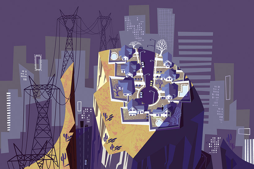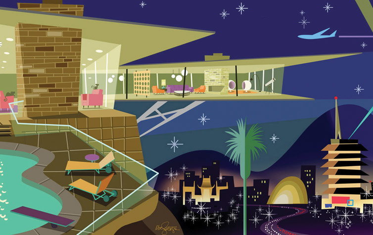 Mac’s personal collection of prints, which he sells online, feature a range of subjects inspired by mid mod design. “Most are urban,” Mac says. “I get ideas for pieces driving around Los Angeles on the freeways or in the desert in Arizona. I like to stylize things people are familiar with, like golf courses, airports or neighborhoods.” His prints, which he describes as “flat and graphic,” capture the visually immersive nature of midcentury shapes and colors, transporting viewers back to a different time while the animated nature of his work gives his art the stylish spirit of the Midcentury Modern era. His prints are limited editions, and they’re printed on museum-quality paper. Depending on his schedule with Disney, they can take anywhere from one week to a couple of months to complete.