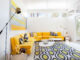 For example, Inside the Wexler home, pops of brilliant yellows capture attention. In the primary bathroom, pops of gold tones add a bit of color to the starker white space that allows the eye to then drift outside to the rocks in the courtyard, a landscaping feature that drains hold in moisture for plants. Meanwhile, in the home’s living room, a huge mid-century sofa, reupholstered in a vibrantly yellow pattern was selected by Modernous to add to the rich color palette. The designers at Modernous spotted the piece on eBay in LA and had it trucked to Palm Springs. The massive sectional just fit the right scale for this large room, says Sally.
