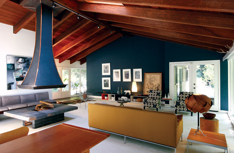 There are so many striking components to this living room that even replicating one part of the room could completely makeover your look. From the fireplace and the vaulted ceilings, to the glass doors and the dark walls, this living room is one from an MCM fairytale.