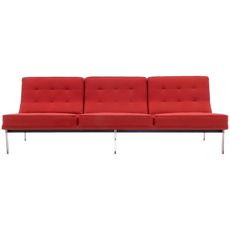 This Florence Knoll Parallel Bar Three-Seat Sofa in a red wool upholstery is perfect for a Midcentury Modern man cave with its minimalist profile and confident hue. Find the original design at 1stdibs. If you balk when you realize a minimalist design does not mean minimalist price, then hop over to Joybird for a more budget-friendly sofa that still clearly says MCM with its linear, armless profile and bold red.