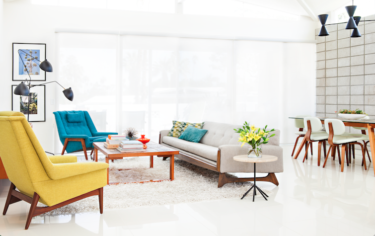 Palm Springs, haven for all that is colorful and midcentury. You don’t need to plan a getaway to have your own rainbow oasis, however. Mix a few accent pieces with minimalist furnishings to recreate this fun retro space. Here are some key pieces to recreate the quintessential Palm Springs-style colorful living room: