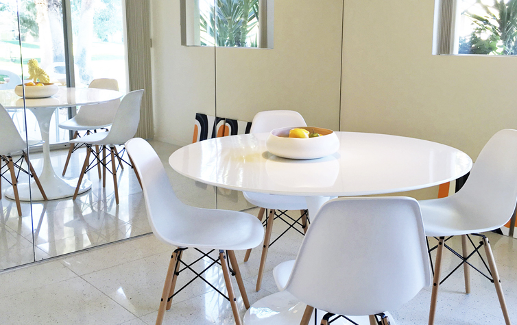 Just because you chose a white monochromatic aesthetic for a room doesn’t mean you won’t have decisions to make. In the absence of multiple colors, you can explore your desires through textures, surfaces, lighting and unique eye-catching decor. If you want the clean, noise-quieting feel of a white midcentury dining room, here are some things to consider: