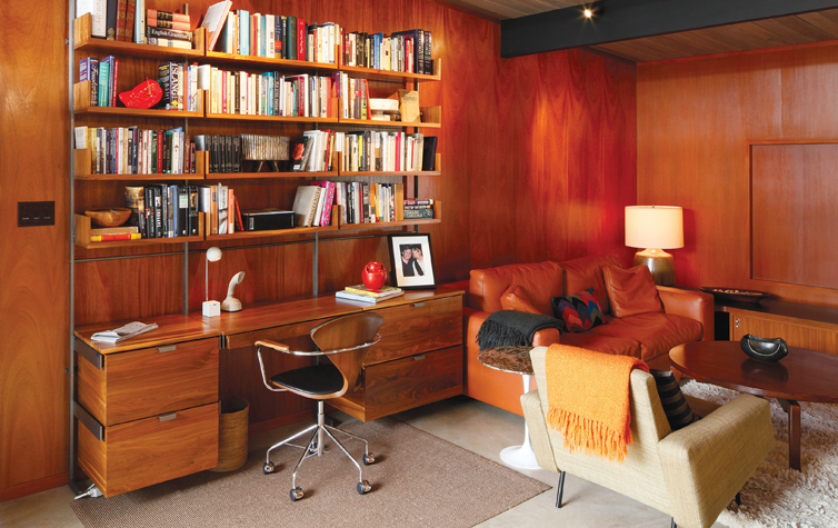 Of course, no midcentury home is worth its salt without classic furniture. This room sports several such pieces, including a Cherner desk chair, Poltrona Frau sofa, Pierre Guariche armchair, Jens Risom coffee table and David Cressey table lamp.