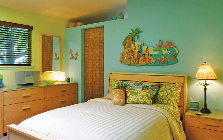 When it comes to patterns, the garish Hawaiian shirts your father used to wear will come in handy. The outline of hibiscus flowers (Hawaii’s state flower) will probably turn up, as well as palm leaves, palm trees, surf boards and hula dancers. Try out these patterns on pillows, comforters, curtains or upholstered furniture in the room, though do be sure not to use too many patterns, or you’ll overwhelm the room. Especially if you have a lot of color in the space already, stick with one or two patterns that will convey the theme without flooding any visitors with too many sensory inputs when they enter.