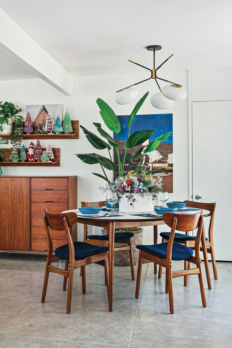 Even during the holiday season, the couple stays faithful to the mid-century vibe in their décor. “We chose a flocked Christmas tree because that was popular during the ’50s and ’60s,” Neil says. “I chose bright colors: turquoise, purple, green and pink.” The pops of color from the tree combined with Neil’s vibrant centerpieces and George’s era-appropriate cookies infuse the space with all the trappings of a perfect desert Christmas, while paying homage to this dwelling’s history.