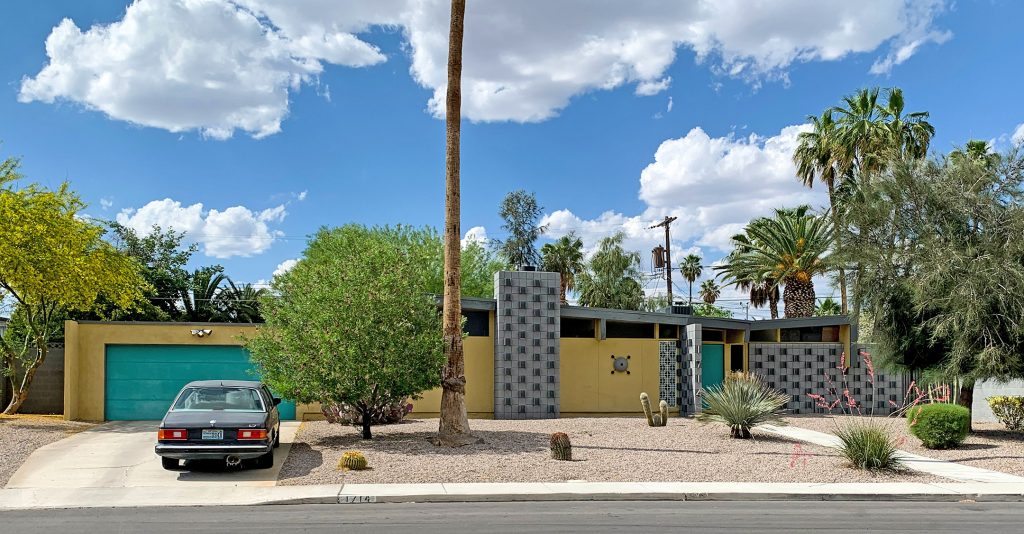 A drive around Paradise Palms neighborhood is a visual feast of house-candy and gush-worth Mid Century Modern design. This neighborhood has everything a mod lover could ever want in an MCM neighborhood, including butterfly roofs, brightly colored doors, breeze-block walls, manicured gardens…the list is just too long. But don’t just take my word for it, I’ve included some of my favorites to hopefully give everybody a little Atomic Ranch home inspo!