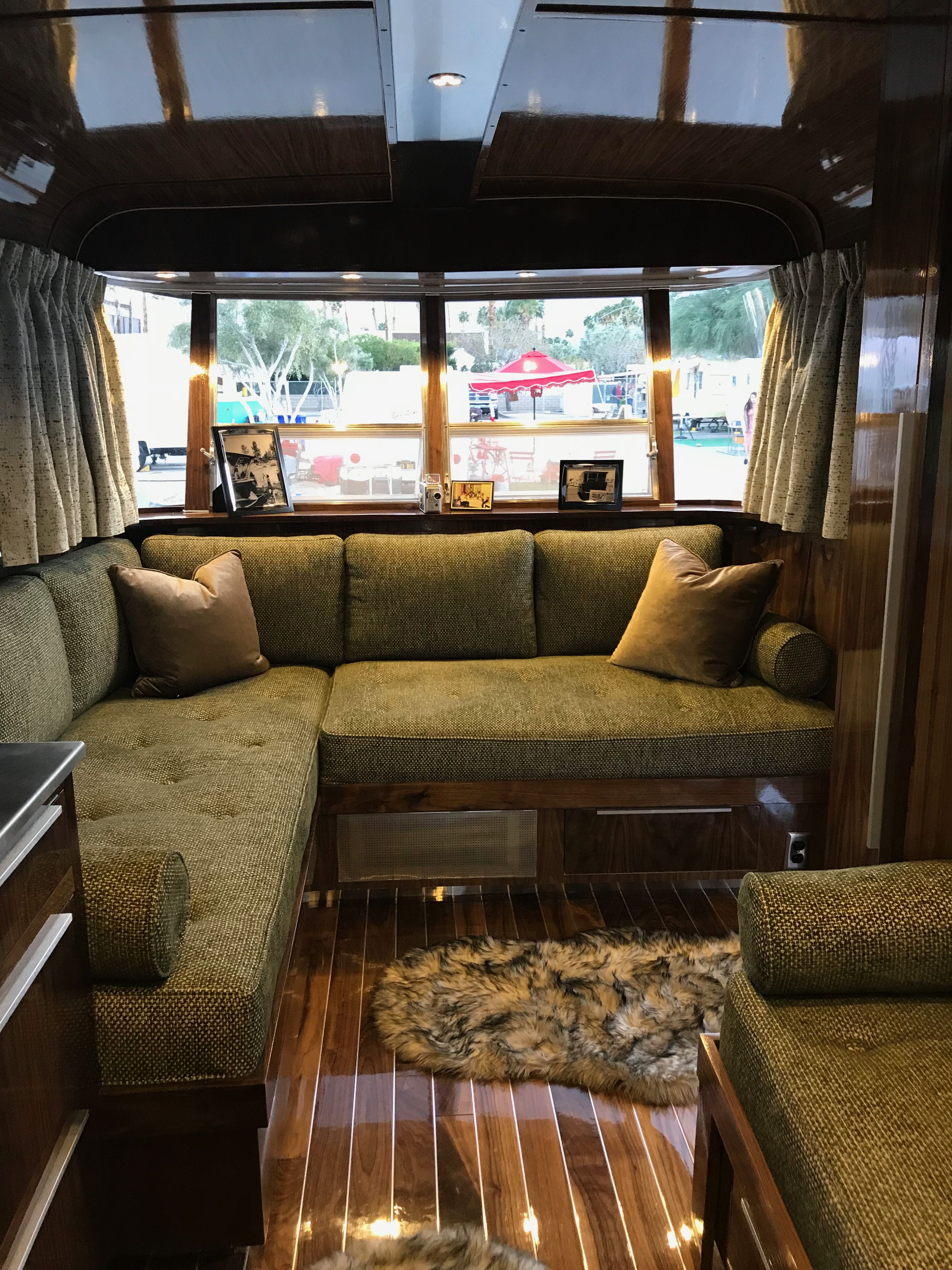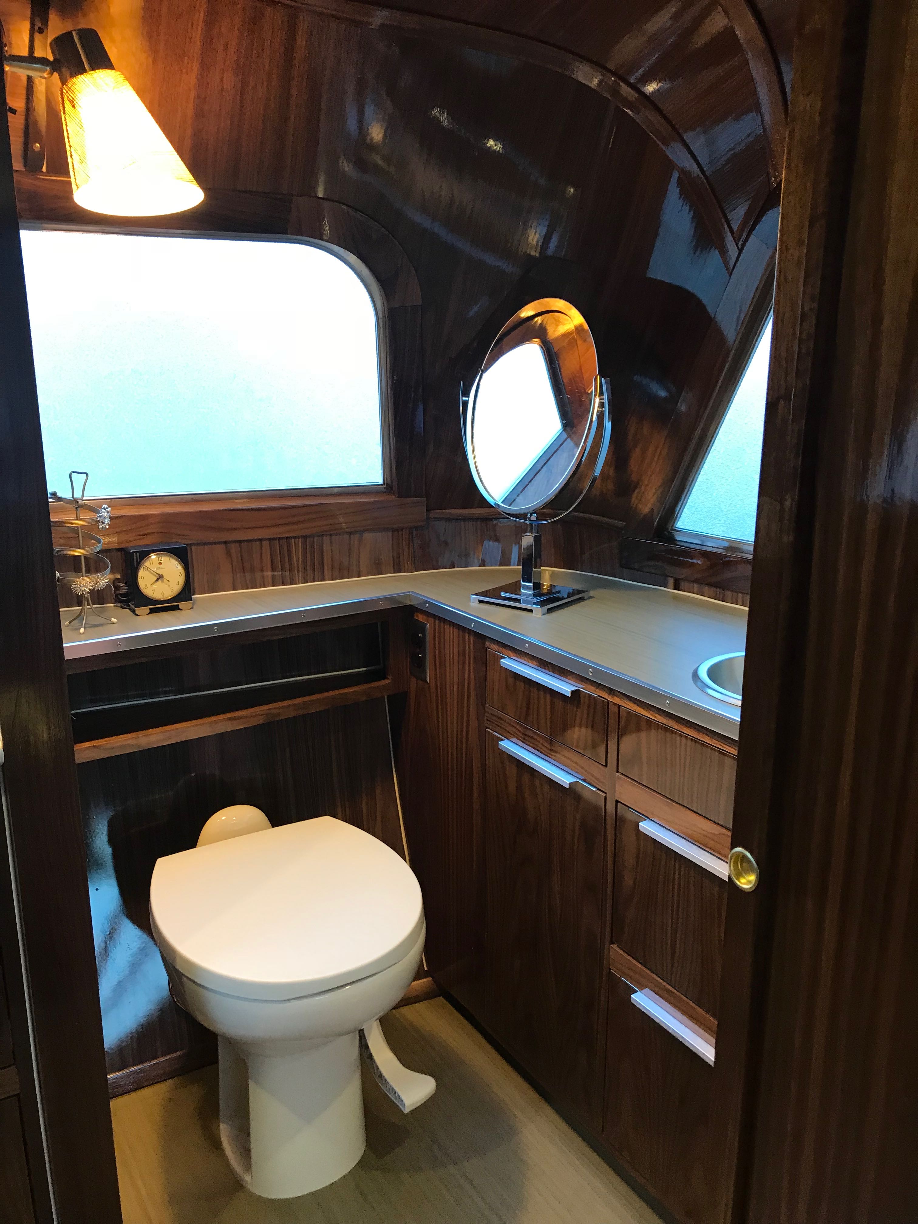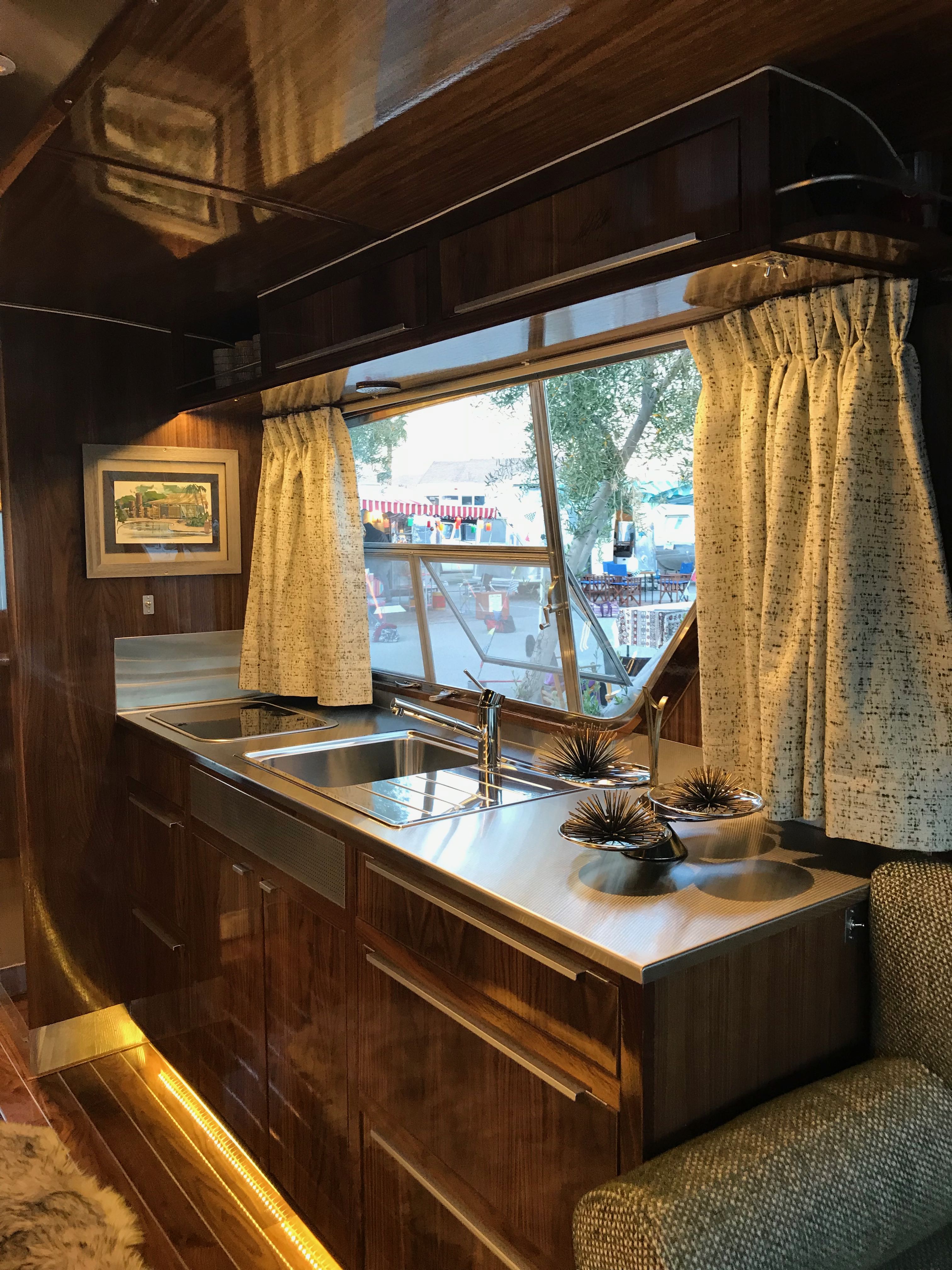 This is no ordinary travel trailer. “The interior features Black Walnut wall skin, cabinetry and black walnut hard wood flooring with custom aluminum detailing. The bathroom/dressing room features Marmoleum flooring, Walnut and Marmoleum countertops and a Stainless Steel shower with a Teak hardwood shower floor insert.”