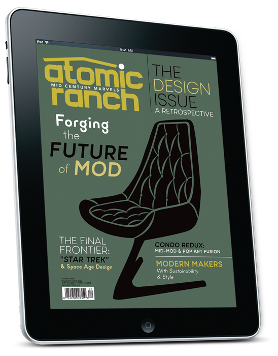 It’s our annual Design Issue—a look back on the icons of the Mid Century Era and a look ahead to the new makers, movers and shakers creating modernist heirlooms for tomorrow. Visit homes featuring designer furnishings and the best of MCM Design. Dive into the work of Eero Aarnio, Alexander Calder and Matti Suuronen. Take a look at the relationship between modern furniture design and Star Trek! Find editor’s picks for sofas, coffee tables, side, chairs, credenzas, lighting, art and accents.