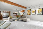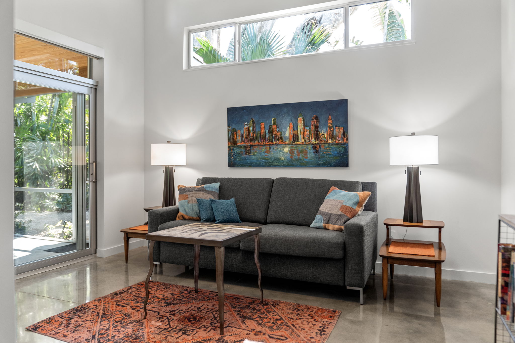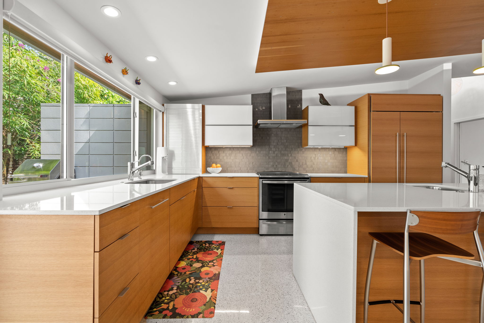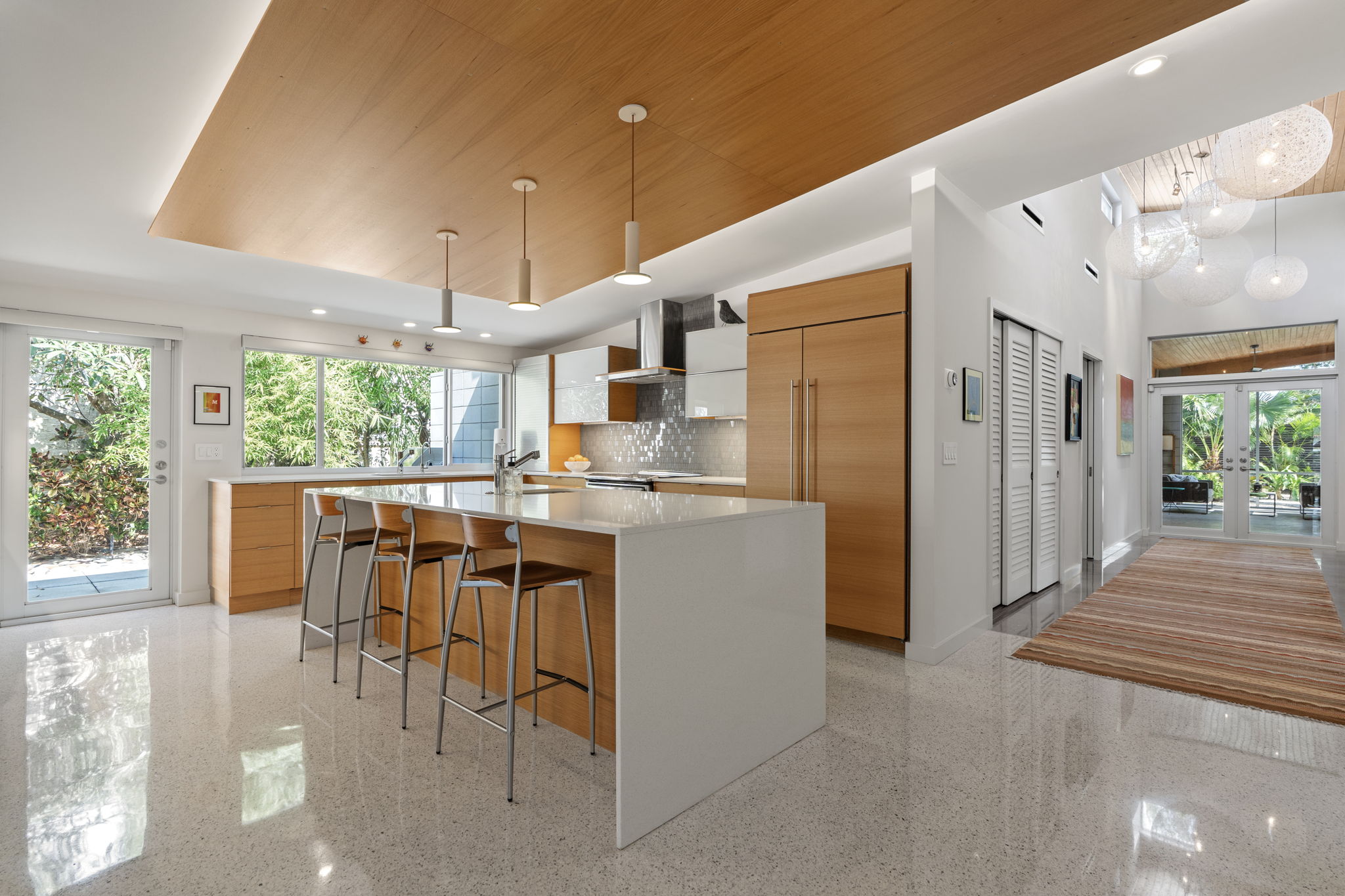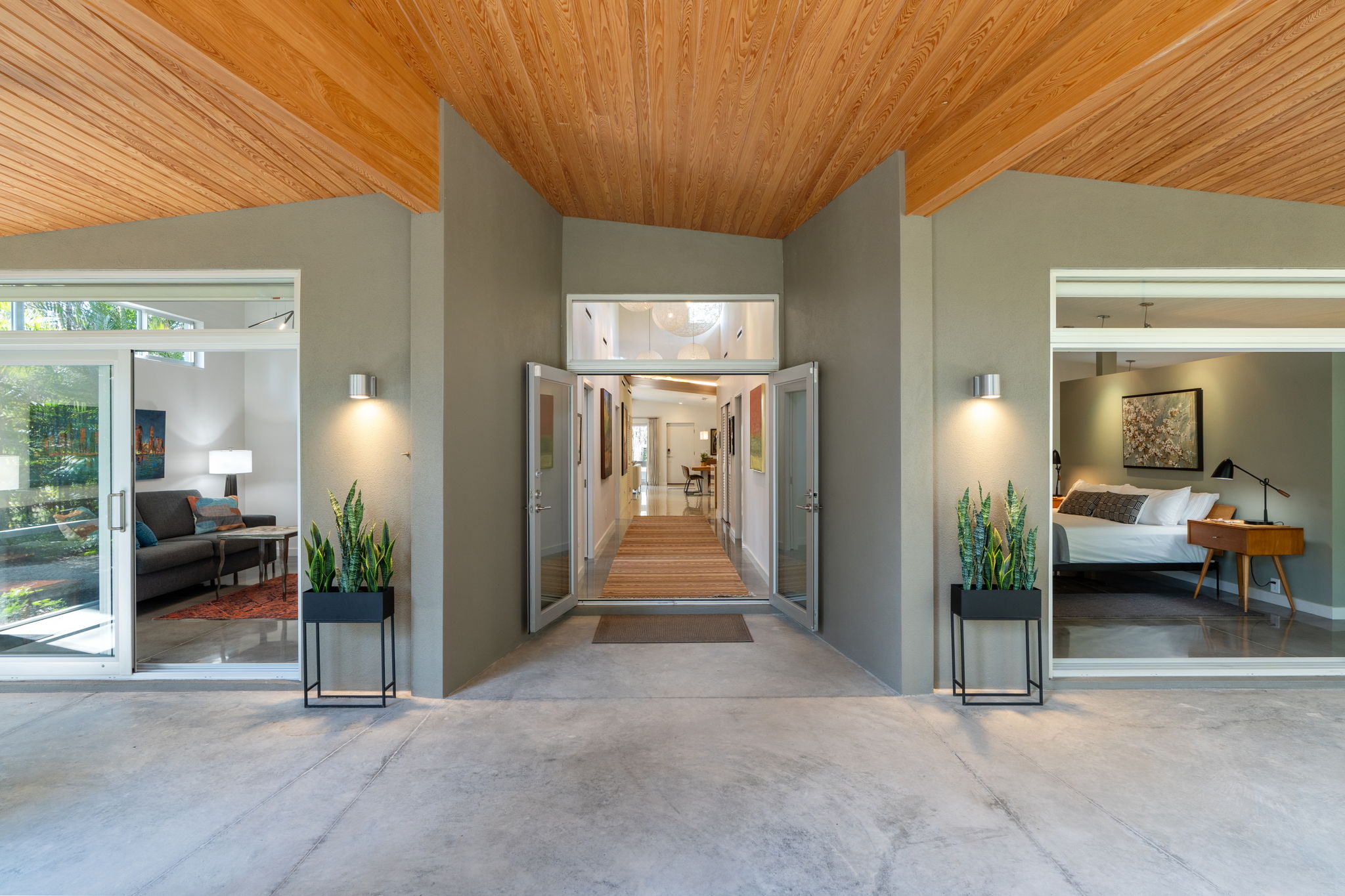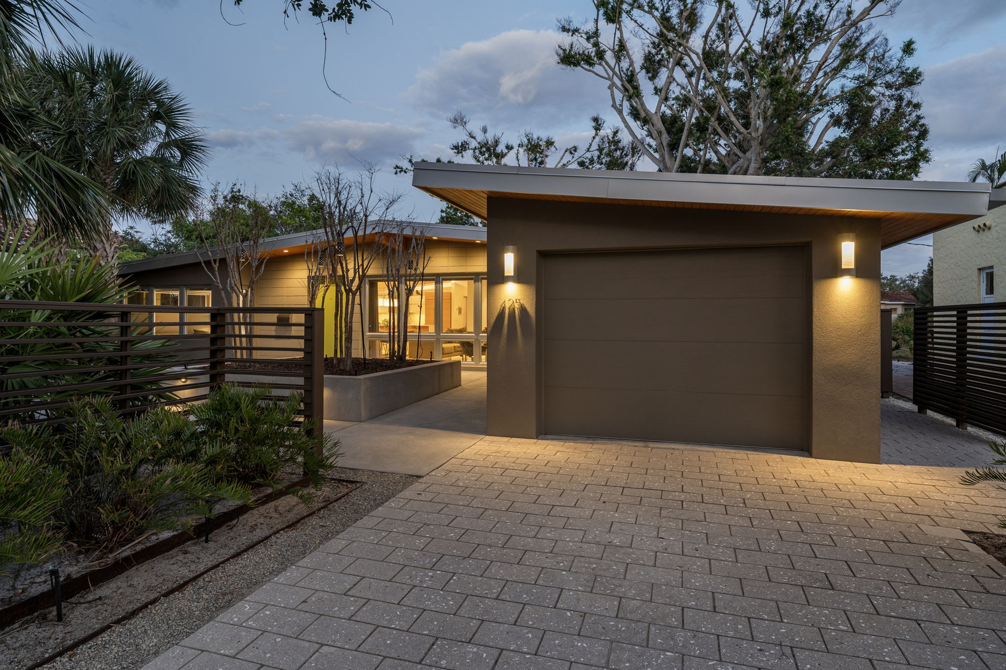 Located in the heart of Venezia Park Historic District, the home flows seamlessly, with windows & doors providing lush garden views from every room while maintaining privacy. There’s a spacious living room, dining area, a timeless Florida Room, office, and a large open kitchen that includes rift cut white oak custom cabinets and floating ceiling, accentuated by the white quartz island and terrazzo floors. Adjacent to the art gallery-like hallway with clerestory windows and vaulted ceilings, are the three ensuite bedrooms with built-in cabinetry. The primary suite boasts a walk-in closet, soaker tub and a private outdoor shower. Two of the bedrooms have sliders out to the dramatic 700 square foot lanai with a soaring cypress tongue & groove ceiling.