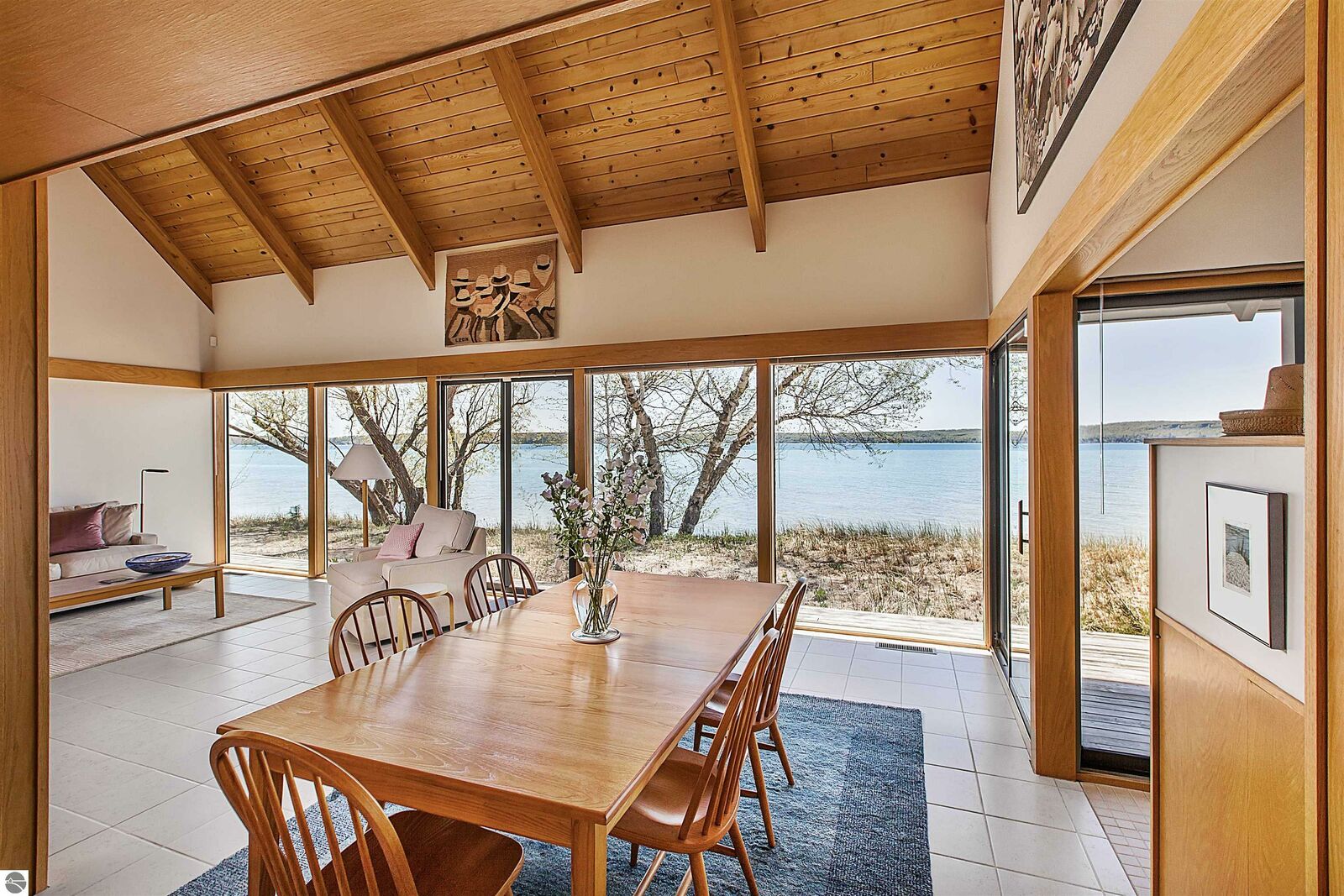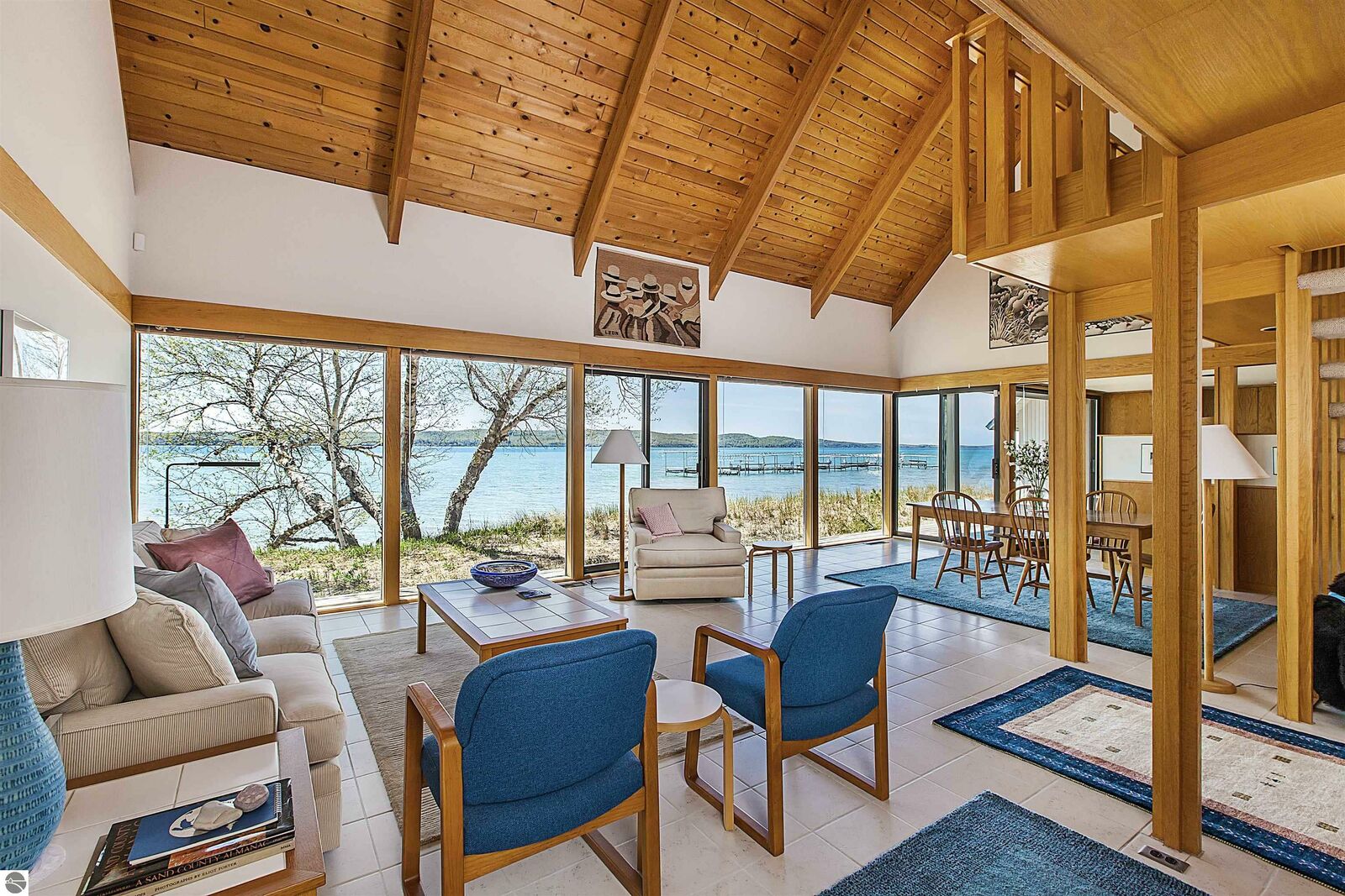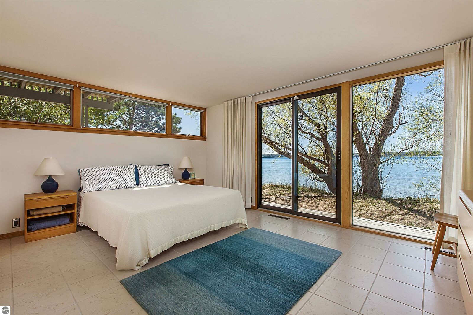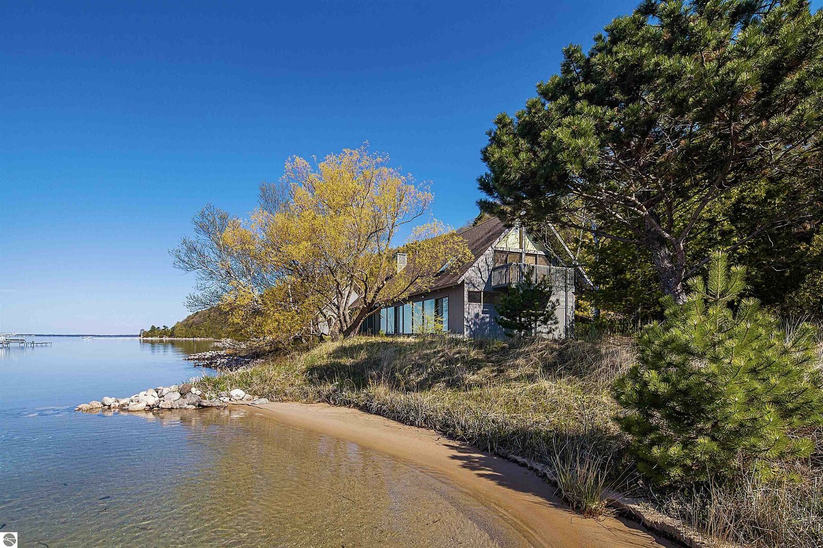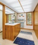 On the north shore of Crystal Lake (Beulah, MI) is an architectural gem: a meticulously constructed home designed by famed mid-century modern architect, Robert C. Metcalf. Metcalf homes are known for fastidious attention to detail, integration of interior and exterior spaces, and high standards of materials and building. Utilizing natural light with large windows and open format, the house is sited harmoniously in its surroundings. The house has 180 feet of private lake frontage, in pristine condition. Landscaped with natural sand, dunegrass, and native trees. Designed for all-season use, the house is luminous and comfortable any time of year. Expansive lake views, lapping waves, sunrise/sunset from all rooms. Swim, hike, ski, bike, walk, kayak, other activities at Crystal Lake, Lake Michigan, and Sleeping Bear Dunes National Lakeshore. One owner since built (1989-90), lightly used, well maintained. House has original furnishings; fine condition. Main floor is open with high wood beams and skylights. Tile floors throughout, red oak trim, wood lattices and glass blocks (Metcalf signatures), job-built cabinetry, vibrant blue exterior doors. Modern simplicity, uncluttered aesthetic. Galley kitchen has dishwasher, electric range/oven, refrigerator; pots/pans, china, cutlery included. Utility room has washer/dryer, work tub, furnace and humidifier, water softener; cleaning eqpt & household tools included. All major appliances in good working order. Detached garage fits two vehicles plus sports gear;outdoor eqpt included. Large garage attic;fixed-ladder access. Sturdy, attractive decks and porches. No fragrance, shoes, smoke, pets inside all years. Security system, standalone generator, new furnace, modern septic system, LED lights, irrigation system, internet-wired, drapes/blinds, stereo system/tv/speakers. Ample space to neighbor properties; lake level maintained all seasons. Authentic MCM with elegance, peace, and irreplaceable beauty.