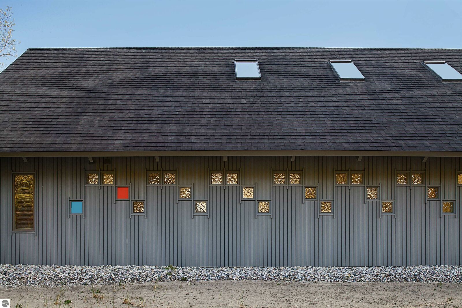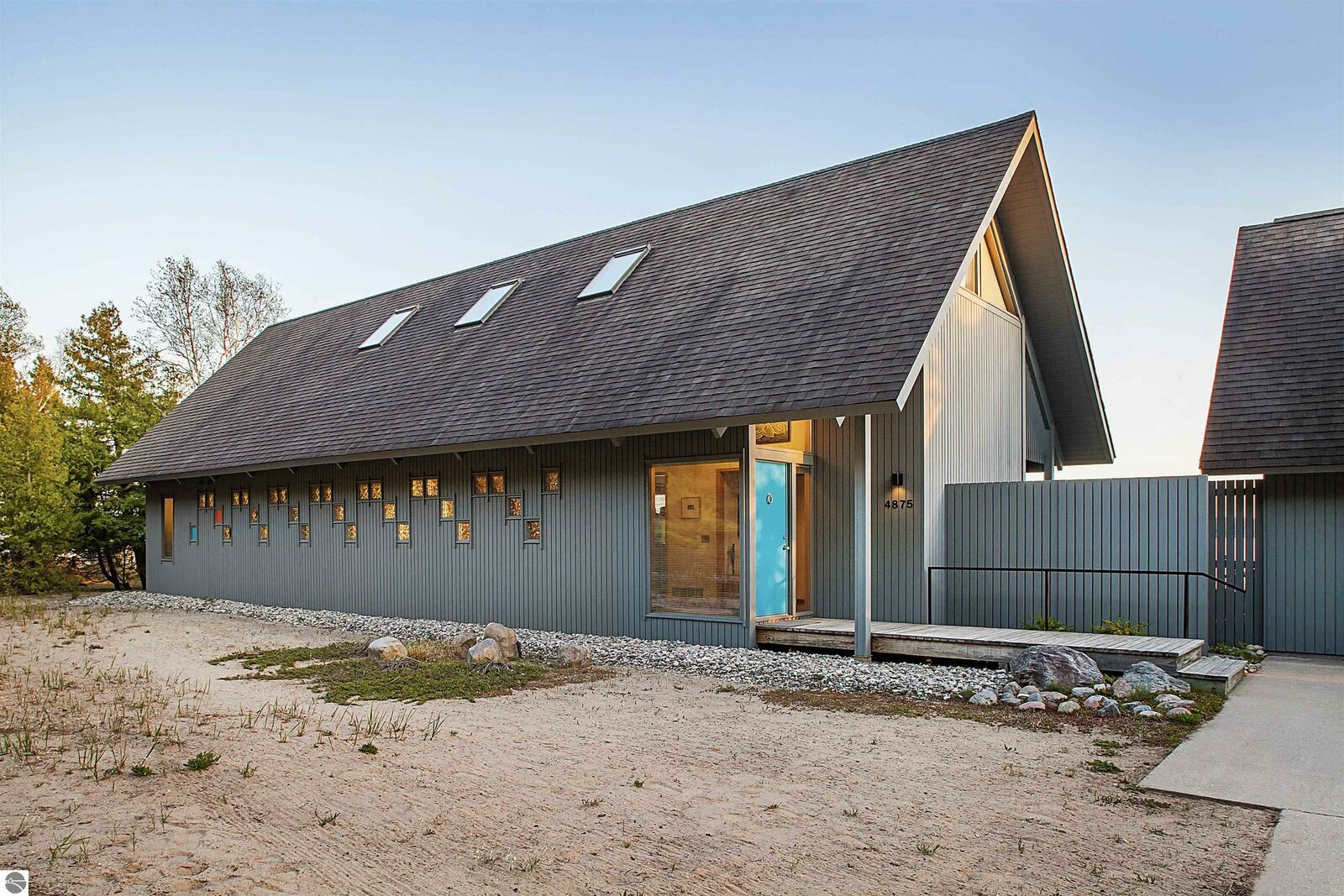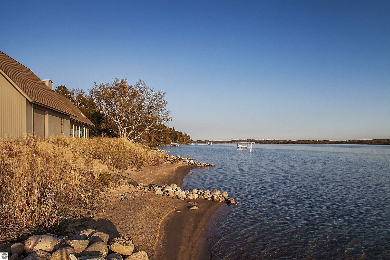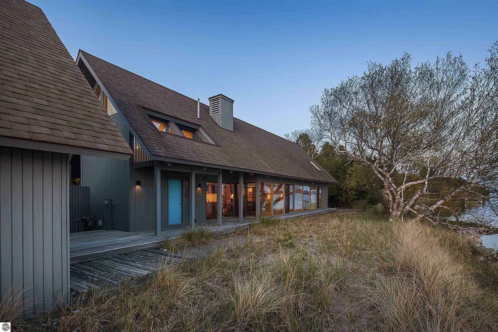 On the north shore of Crystal Lake (Beulah, MI) is an architectural gem: a meticulously constructed home designed by famed mid-century modern architect, Robert C. Metcalf. Metcalf homes are known for fastidious attention to detail, integration of interior and exterior spaces, and high standards of materials and building. Utilizing natural light with large windows and open format, the house is sited harmoniously in its surroundings. The house has 180 feet of private lake frontage, in pristine condition. Landscaped with natural sand, dunegrass, and native trees. Designed for all-season use, the house is luminous and comfortable any time of year. Expansive lake views, lapping waves, sunrise/sunset from all rooms. Swim, hike, ski, bike, walk, kayak, other activities at Crystal Lake, Lake Michigan, and Sleeping Bear Dunes National Lakeshore. One owner since built (1989-90), lightly used, well maintained. House has original furnishings; fine condition. Main floor is open with high wood beams and skylights. Tile floors throughout, red oak trim, wood lattices and glass blocks (Metcalf signatures), job-built cabinetry, vibrant blue exterior doors. Modern simplicity, uncluttered aesthetic. Galley kitchen has dishwasher, electric range/oven, refrigerator; pots/pans, china, cutlery included. Utility room has washer/dryer, work tub, furnace and humidifier, water softener; cleaning eqpt & household tools included. All major appliances in good working order. Detached garage fits two vehicles plus sports gear;outdoor eqpt included. Large garage attic;fixed-ladder access. Sturdy, attractive decks and porches. No fragrance, shoes, smoke, pets inside all years. Security system, standalone generator, new furnace, modern septic system, LED lights, irrigation system, internet-wired, drapes/blinds, stereo system/tv/speakers. Ample space to neighbor properties; lake level maintained all seasons. Authentic MCM with elegance, peace, and irreplaceable beauty.