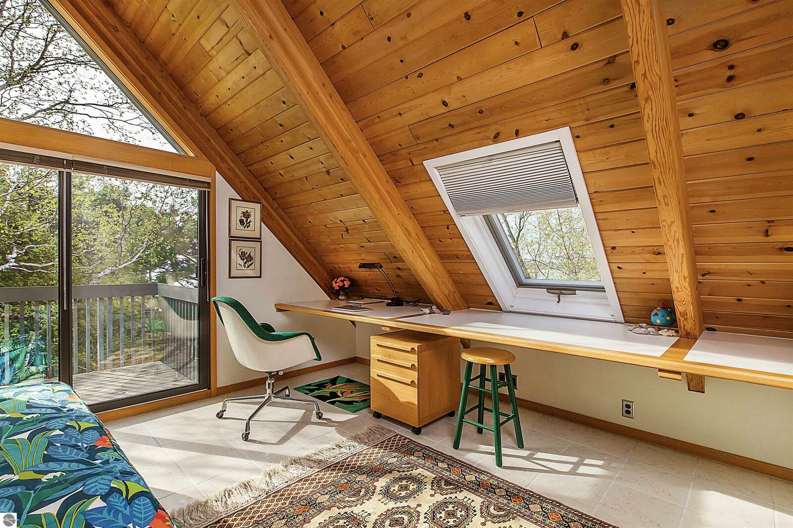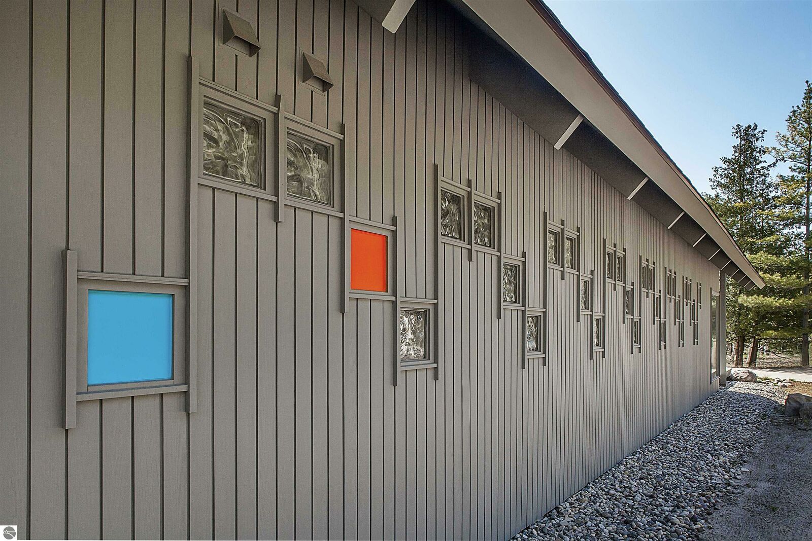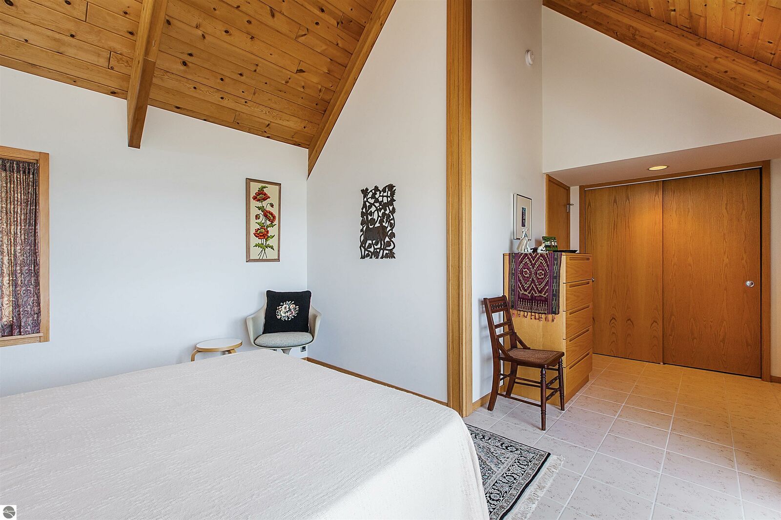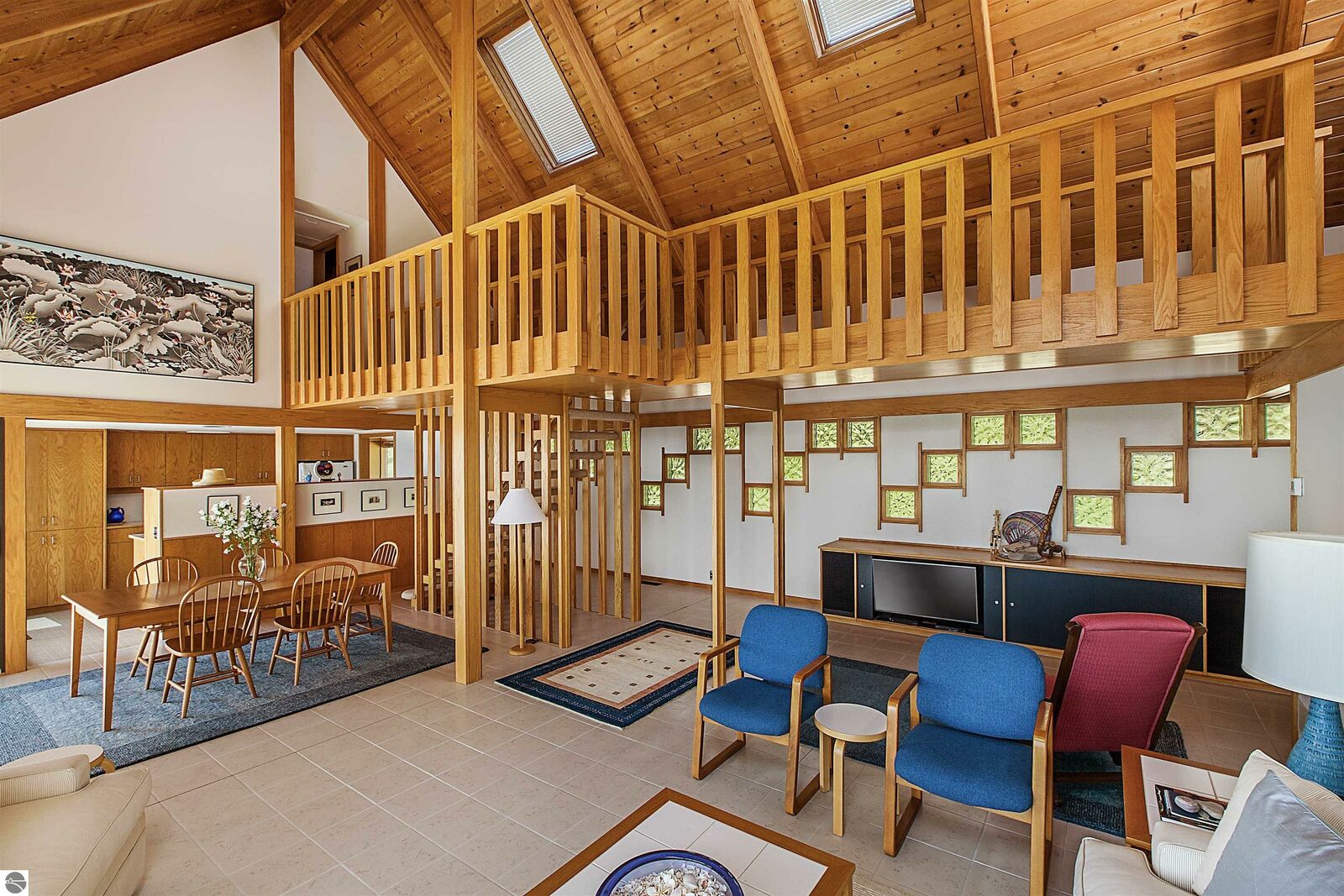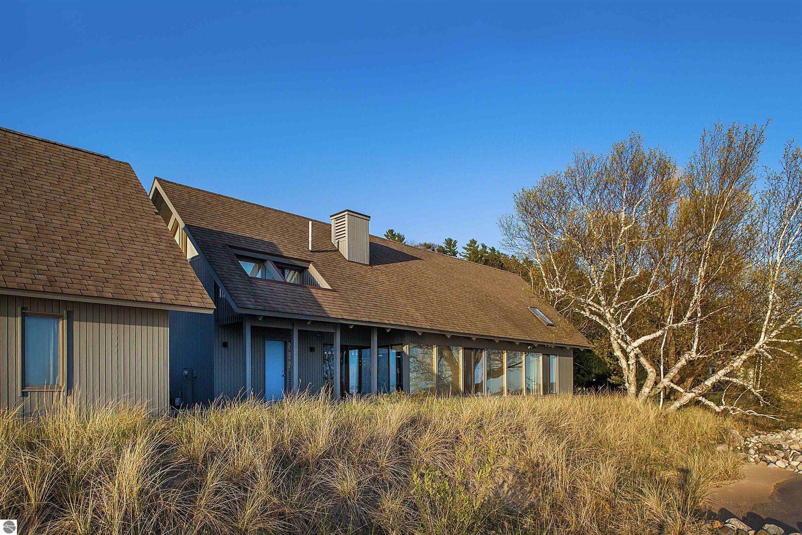 On the north shore of Crystal Lake (Beulah, MI) is an architectural gem: a meticulously constructed home designed by famed mid-century modern architect, Robert C. Metcalf. Metcalf homes are known for fastidious attention to detail, integration of interior and exterior spaces, and high standards of materials and building. Utilizing natural light with large windows and open format, the house is sited harmoniously in its surroundings. The house has 180 feet of private lake frontage, in pristine condition. Landscaped with natural sand, dunegrass, and native trees. Designed for all-season use, the house is luminous and comfortable any time of year. Expansive lake views, lapping waves, sunrise/sunset from all rooms. Swim, hike, ski, bike, walk, kayak, other activities at Crystal Lake, Lake Michigan, and Sleeping Bear Dunes National Lakeshore. One owner since built (1989-90), lightly used, well maintained. House has original furnishings; fine condition. Main floor is open with high wood beams and skylights. Tile floors throughout, red oak trim, wood lattices and glass blocks (Metcalf signatures), job-built cabinetry, vibrant blue exterior doors. Modern simplicity, uncluttered aesthetic. Galley kitchen has dishwasher, electric range/oven, refrigerator; pots/pans, china, cutlery included. Utility room has washer/dryer, work tub, furnace and humidifier, water softener; cleaning eqpt & household tools included. All major appliances in good working order. Detached garage fits two vehicles plus sports gear;outdoor eqpt included. Large garage attic;fixed-ladder access. Sturdy, attractive decks and porches. No fragrance, shoes, smoke, pets inside all years. Security system, standalone generator, new furnace, modern septic system, LED lights, irrigation system, internet-wired, drapes/blinds, stereo system/tv/speakers. Ample space to neighbor properties; lake level maintained all seasons. Authentic MCM with elegance, peace, and irreplaceable beauty.