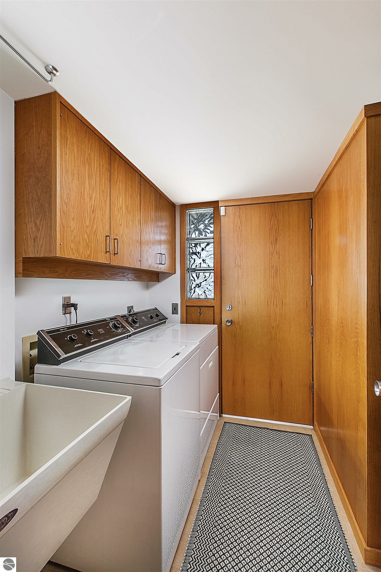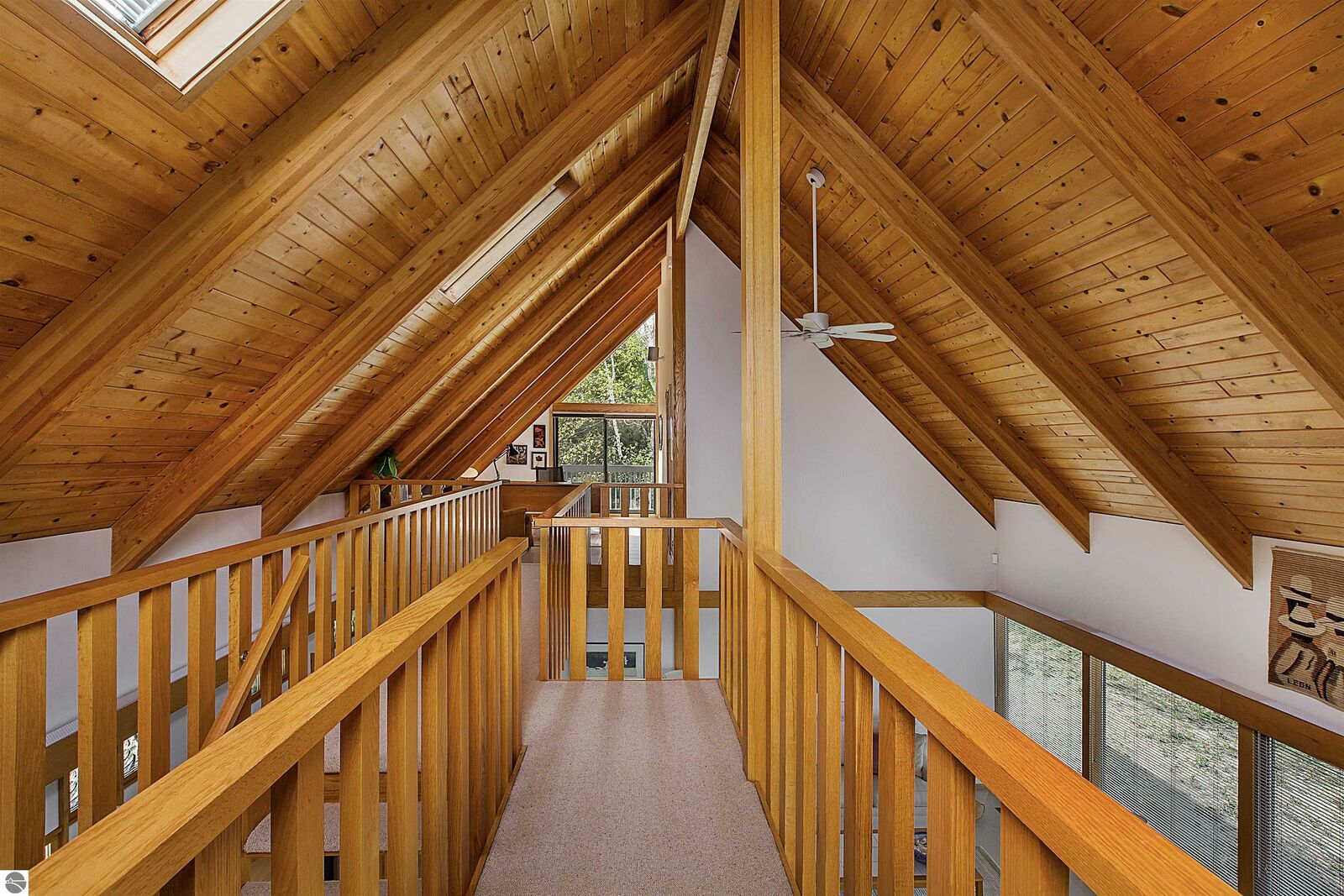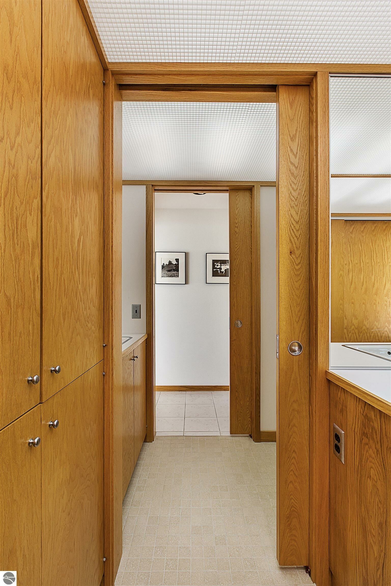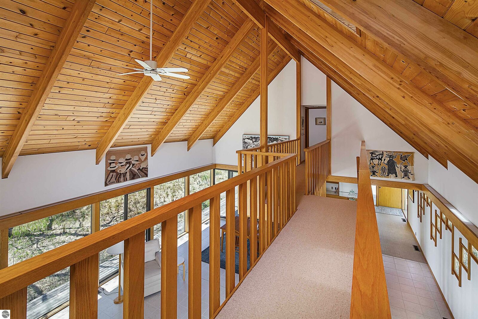 On the north shore of Crystal Lake (Beulah, MI) is an architectural gem: a meticulously constructed home designed by famed mid-century modern architect, Robert C. Metcalf. Metcalf homes are known for fastidious attention to detail, integration of interior and exterior spaces, and high standards of materials and building. Utilizing natural light with large windows and open format, the house is sited harmoniously in its surroundings. The house has 180 feet of private lake frontage, in pristine condition. Landscaped with natural sand, dunegrass, and native trees. Designed for all-season use, the house is luminous and comfortable any time of year. Expansive lake views, lapping waves, sunrise/sunset from all rooms. Swim, hike, ski, bike, walk, kayak, other activities at Crystal Lake, Lake Michigan, and Sleeping Bear Dunes National Lakeshore. One owner since built (1989-90), lightly used, well maintained. House has original furnishings; fine condition. Main floor is open with high wood beams and skylights. Tile floors throughout, red oak trim, wood lattices and glass blocks (Metcalf signatures), job-built cabinetry, vibrant blue exterior doors. Modern simplicity, uncluttered aesthetic. Galley kitchen has dishwasher, electric range/oven, refrigerator; pots/pans, china, cutlery included. Utility room has washer/dryer, work tub, furnace and humidifier, water softener; cleaning eqpt & household tools included. All major appliances in good working order. Detached garage fits two vehicles plus sports gear;outdoor eqpt included. Large garage attic;fixed-ladder access. Sturdy, attractive decks and porches. No fragrance, shoes, smoke, pets inside all years. Security system, standalone generator, new furnace, modern septic system, LED lights, irrigation system, internet-wired, drapes/blinds, stereo system/tv/speakers. Ample space to neighbor properties; lake level maintained all seasons. Authentic MCM with elegance, peace, and irreplaceable beauty.