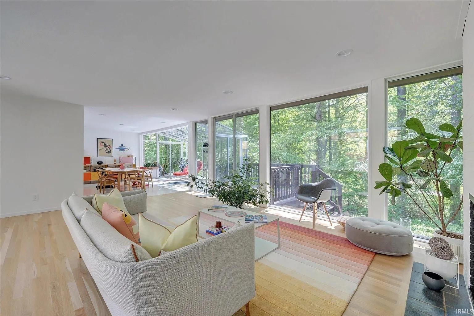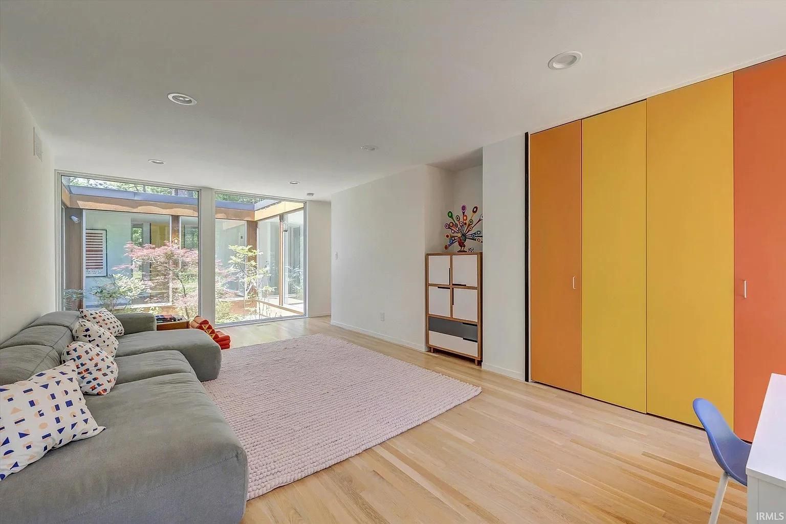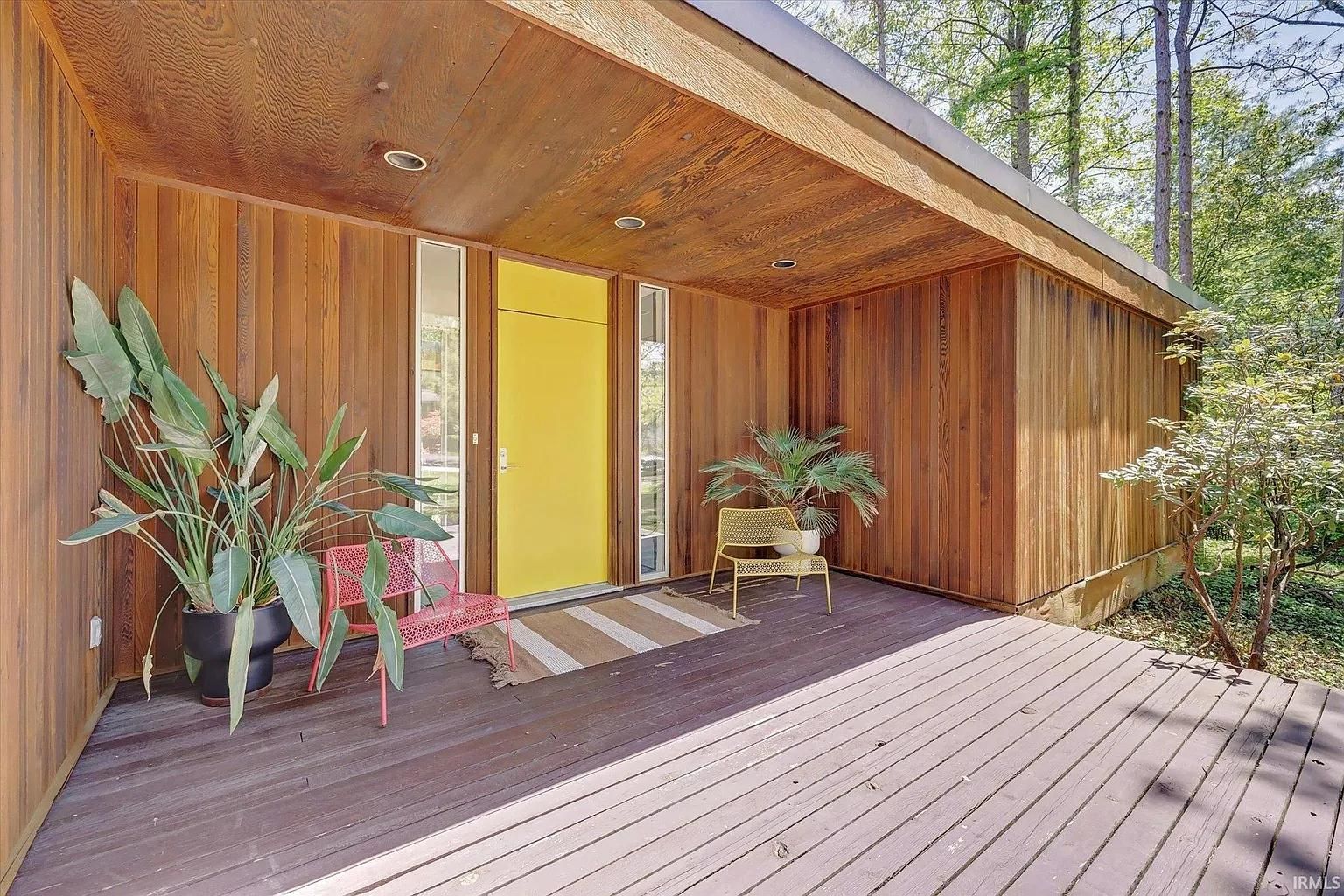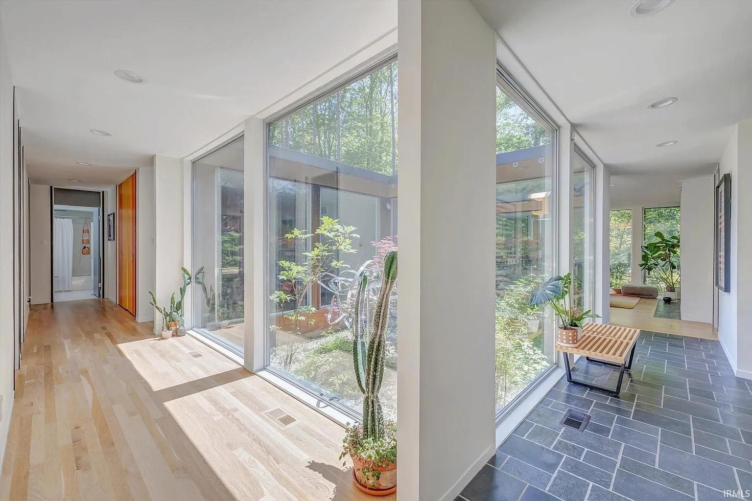 The home’s open floor plan, featured in Better Homes & Gardens and Dwell magazines, connects all rooms in a square around a central open-air atrium that welcomes guests into the heart of the home. The flow of the home allows for ease of entertaining from the indoors to the outdoors. The artistic and cultural enthusiast will feel captivated by the home’s clean lines, beautiful natural materials, abundant natural light, wide expanses of glass, and seclusion on a cul-de-sac. You’ll never want to leave home! But when you do, you don’t have to go far for popular dining and coffee, grocers, sports facilities, a movie theater, and Indiana University campus. Live in harmony with nature, yet close to it all!