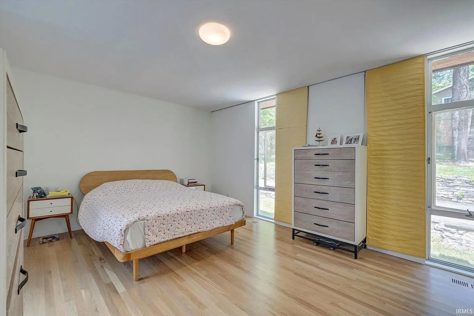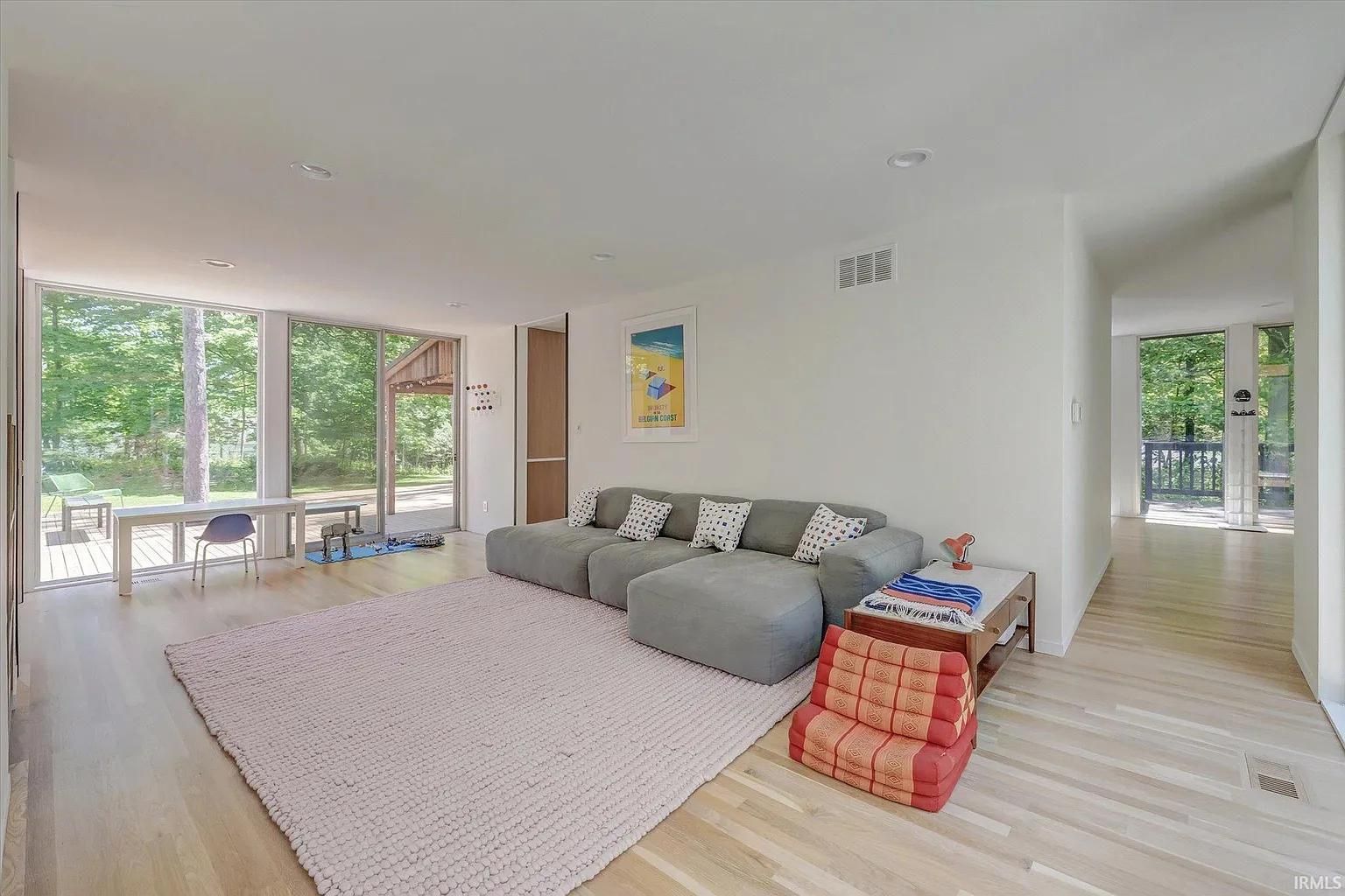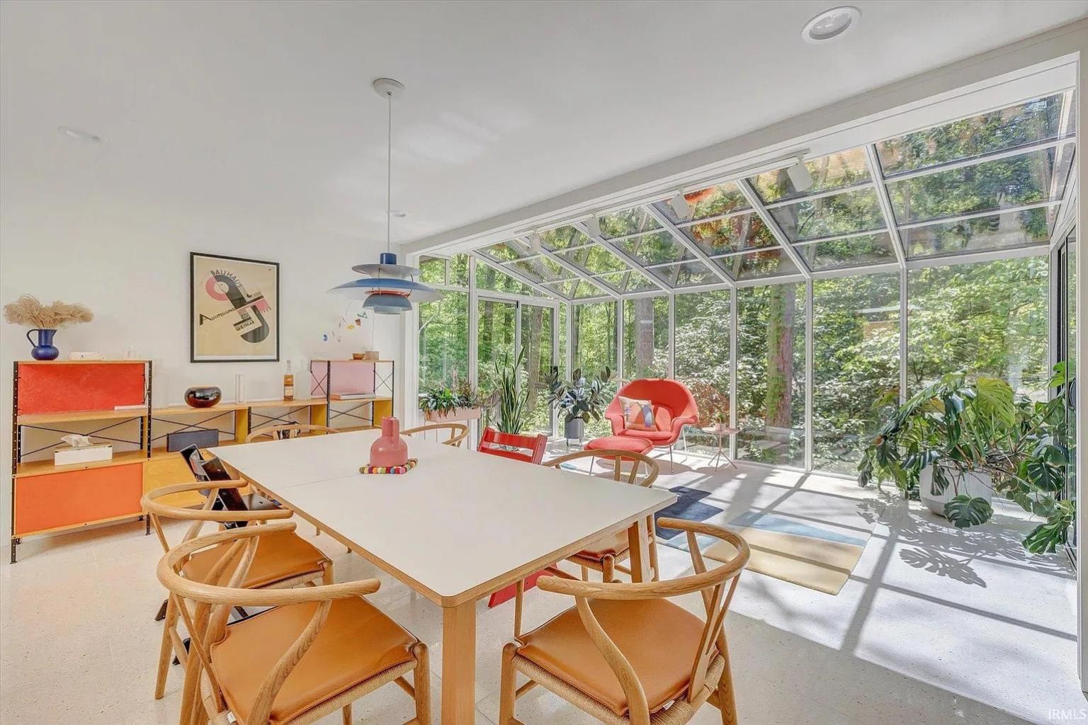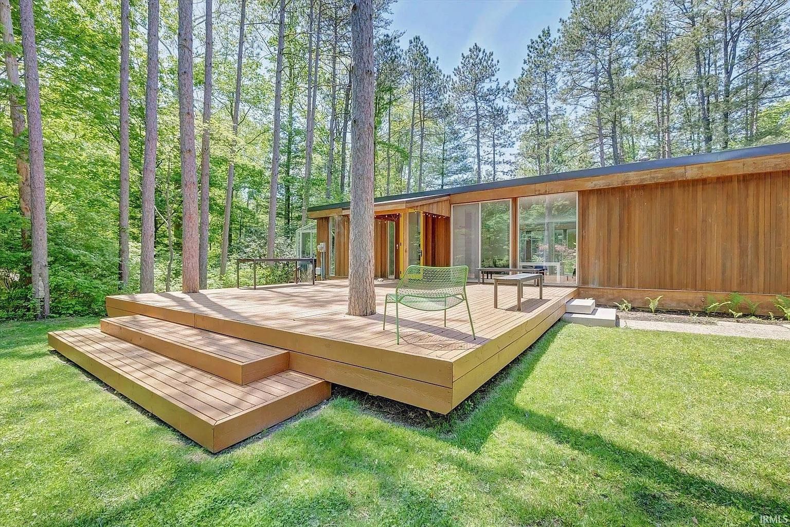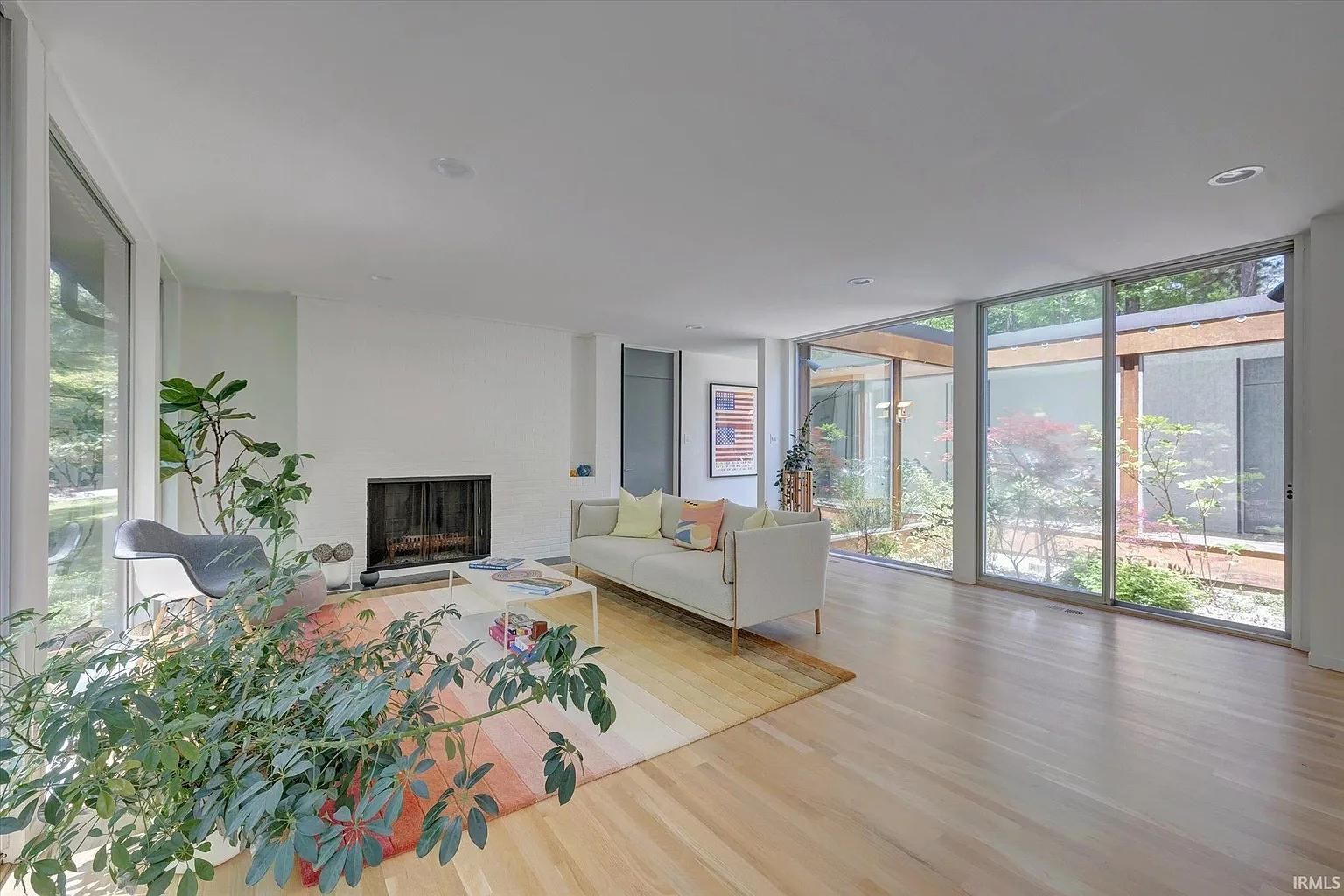 The home’s open floor plan, featured in Better Homes & Gardens and Dwell magazines, connects all rooms in a square around a central open-air atrium that welcomes guests into the heart of the home. The flow of the home allows for ease of entertaining from the indoors to the outdoors. The artistic and cultural enthusiast will feel captivated by the home’s clean lines, beautiful natural materials, abundant natural light, wide expanses of glass, and seclusion on a cul-de-sac. You’ll never want to leave home! But when you do, you don’t have to go far for popular dining and coffee, grocers, sports facilities, a movie theater, and Indiana University campus. Live in harmony with nature, yet close to it all!