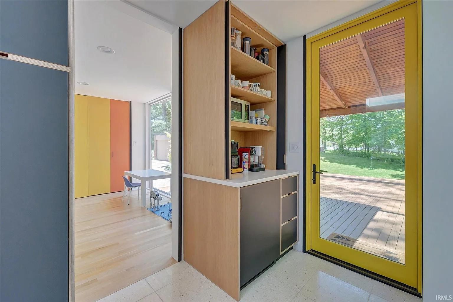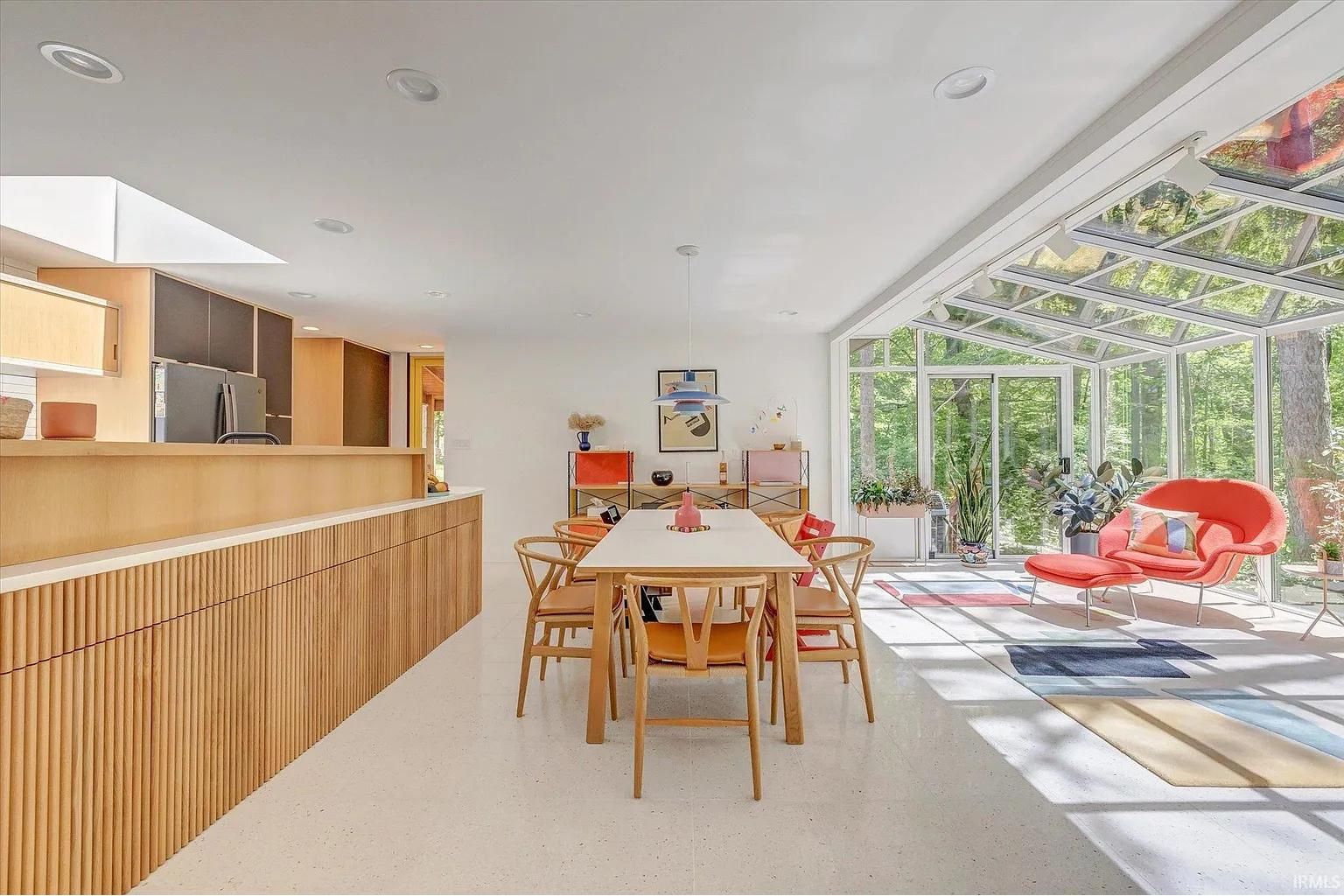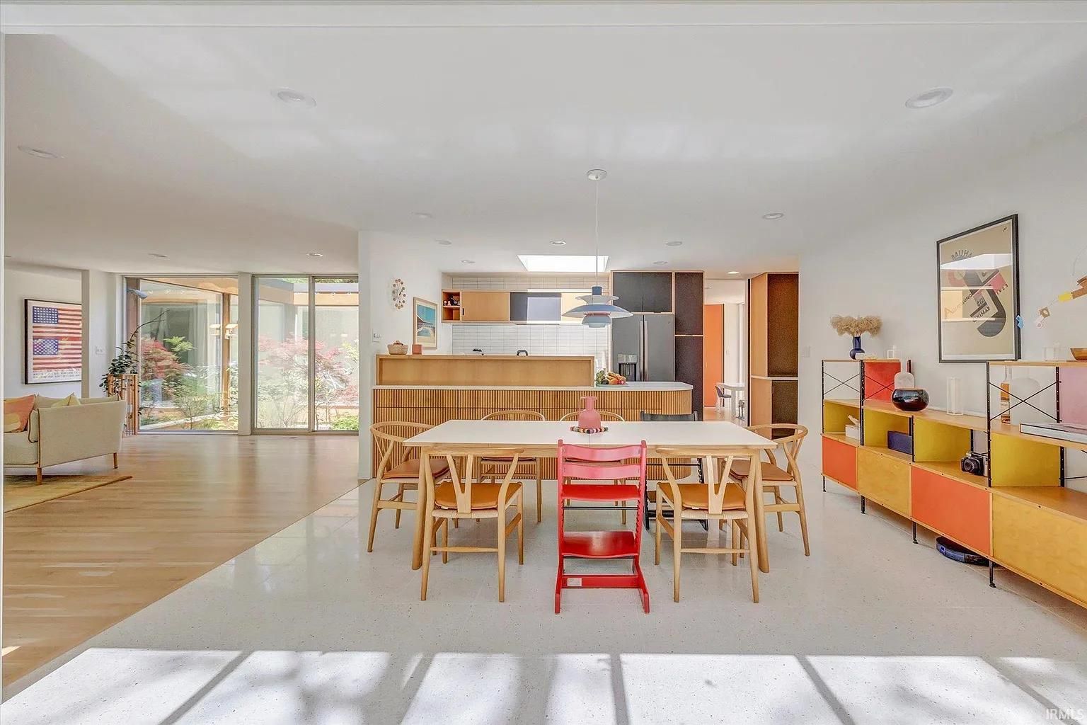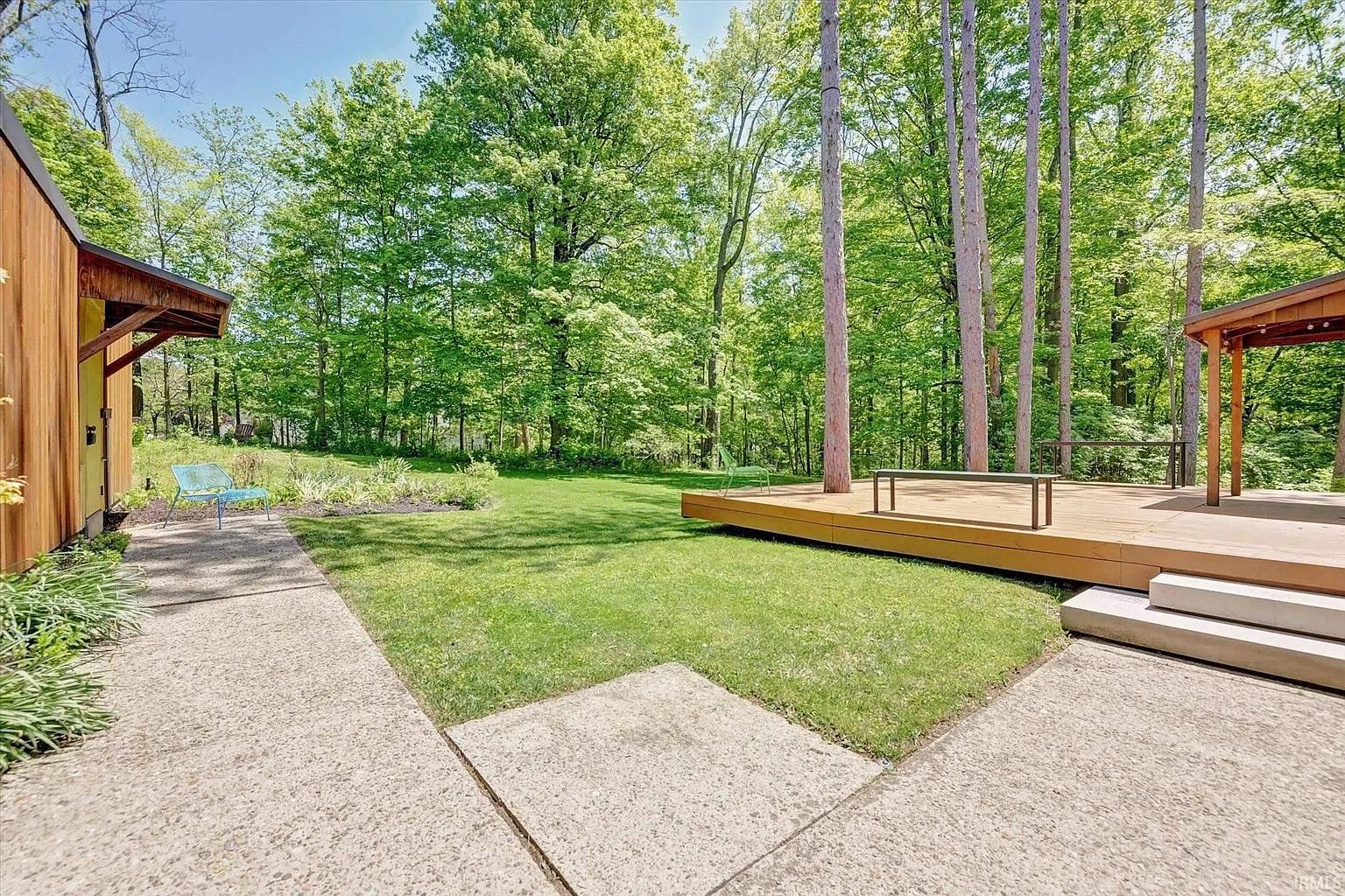 The home’s open floor plan, featured in Better Homes & Gardens and Dwell magazines, connects all rooms in a square around a central open-air atrium that welcomes guests into the heart of the home. The flow of the home allows for ease of entertaining from the indoors to the outdoors. The artistic and cultural enthusiast will feel captivated by the home’s clean lines, beautiful natural materials, abundant natural light, wide expanses of glass, and seclusion on a cul-de-sac. You’ll never want to leave home! But when you do, you don’t have to go far for popular dining and coffee, grocers, sports facilities, a movie theater, and Indiana University campus. Live in harmony with nature, yet close to it all!
