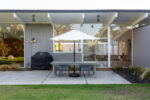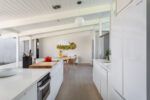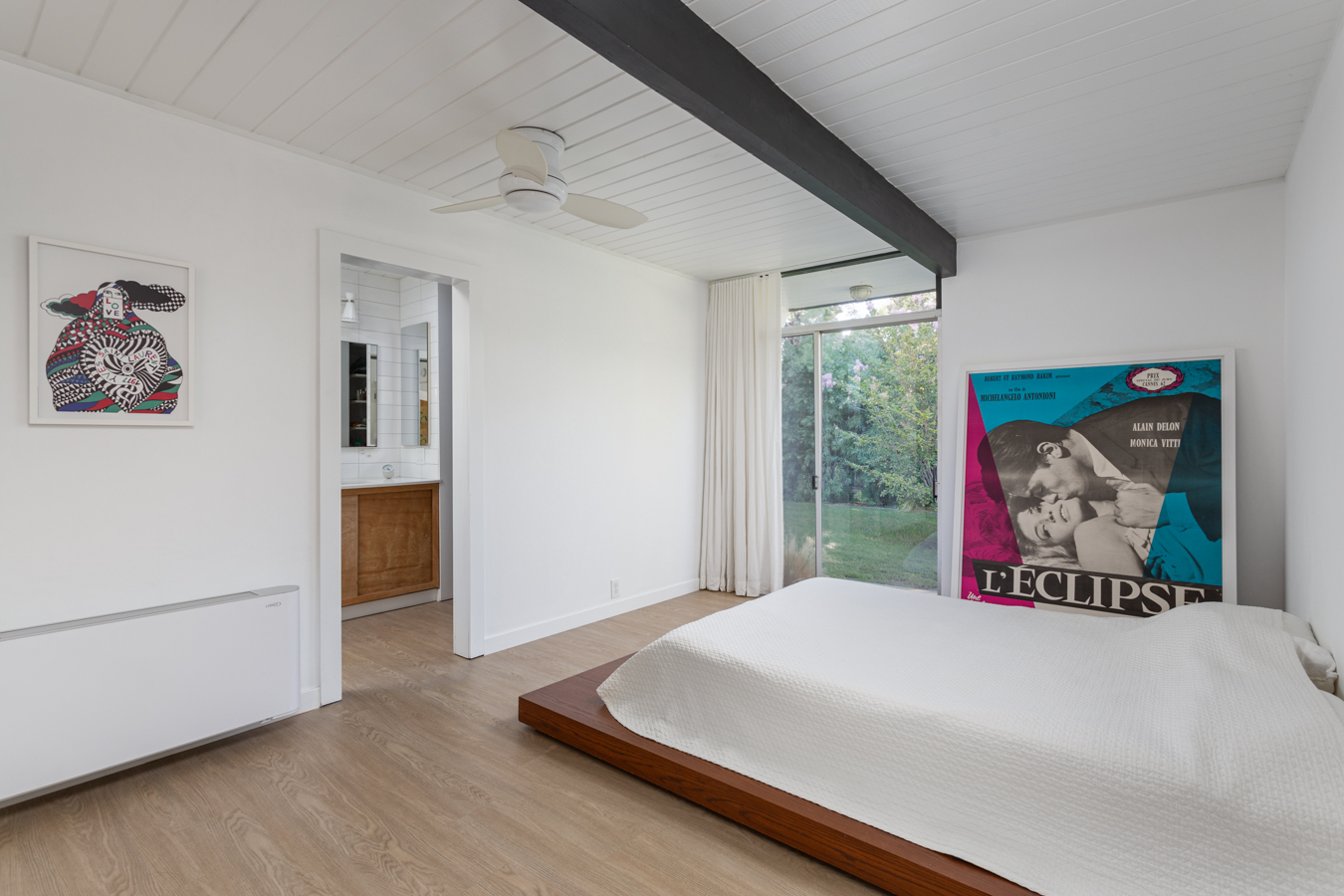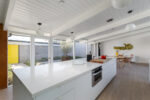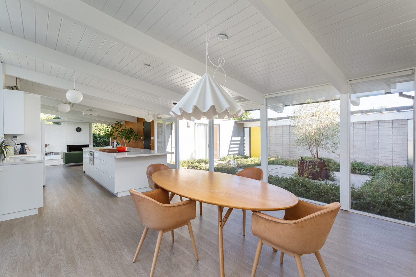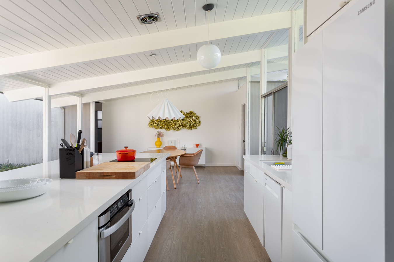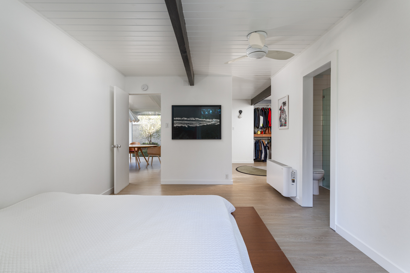 The master bedroom has two walk-in closets which seamlessly incorporates the third bedroom, providing a huge master suite with direct access to the sprawling back garden. With split systems throughout for efficient cooling and heating, rest assured you have year-round comfort. Before you ask; yes! the radiant heated floors is still accessible. Immediately notice the sleek LVT flooring throughout the entire open-plan living space, captivating high ceilings and beams, with a minimalistic feel of this professionally kept Eichler work of art. The kitchen now features custom cabinetry and new appliances, including a refrigerator and dishwasher. The bathroom showcases a distinctive fixed glass panel in original Eichler textured glass, adding a unique yet updated touch.