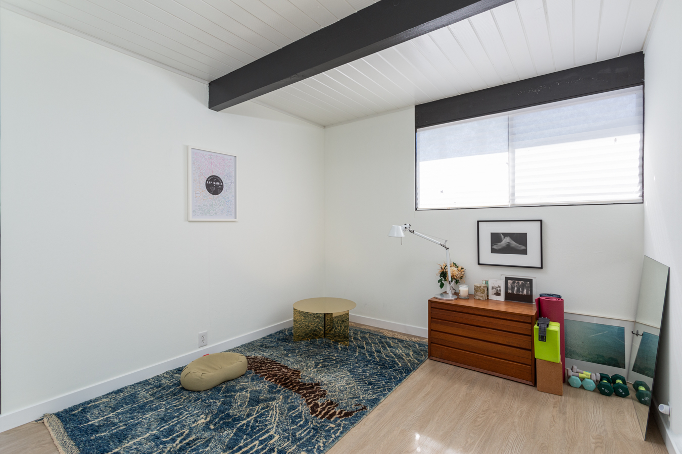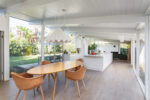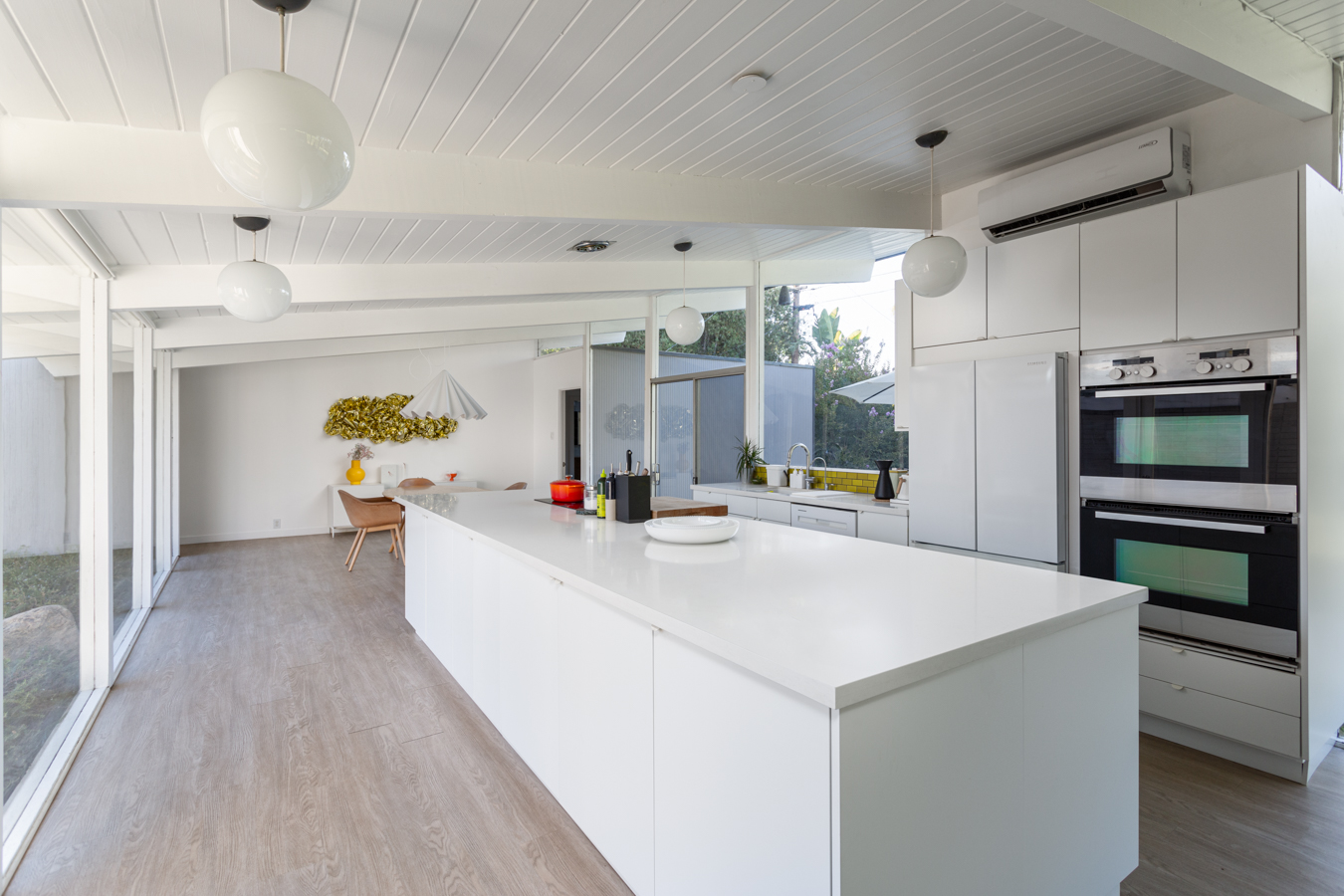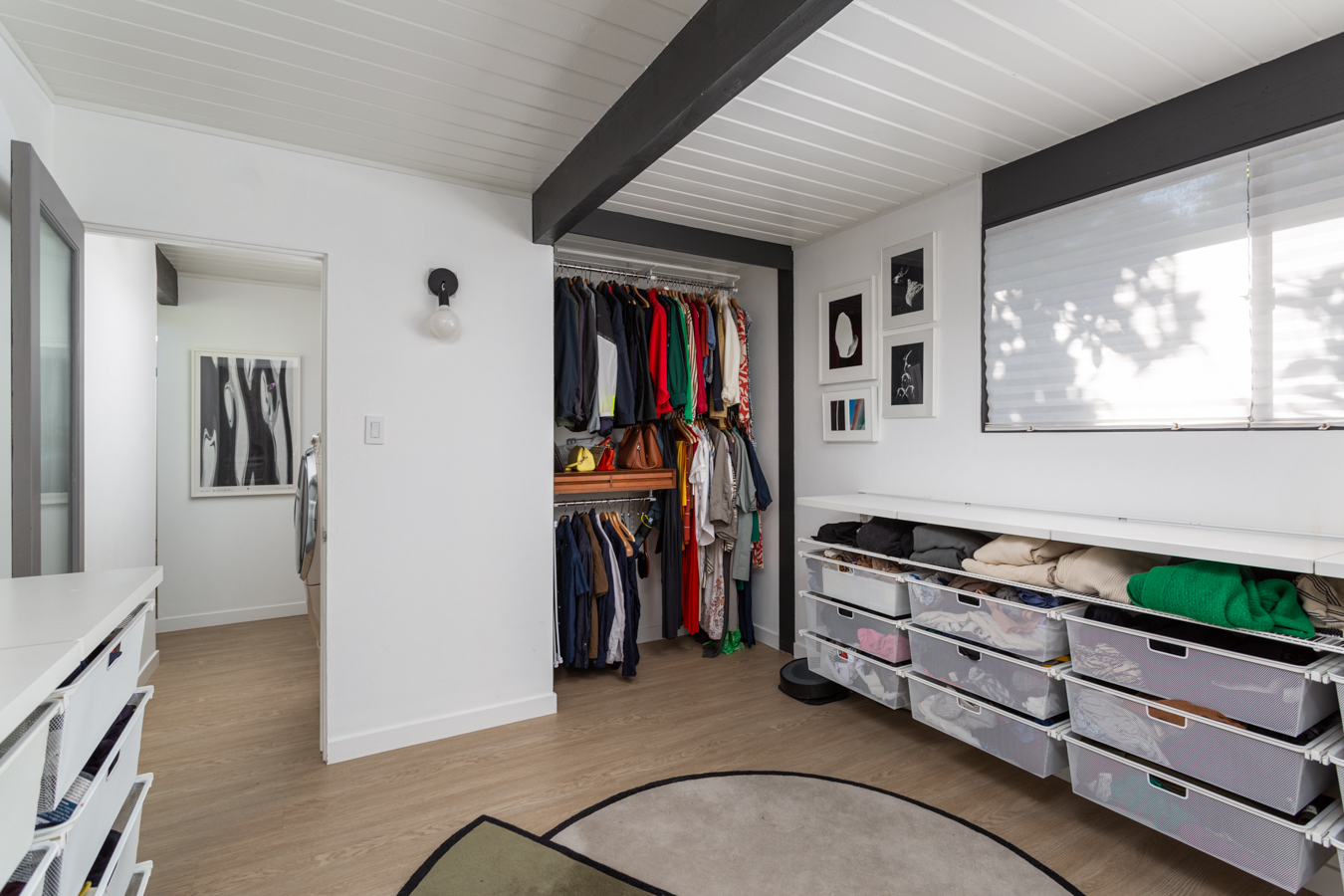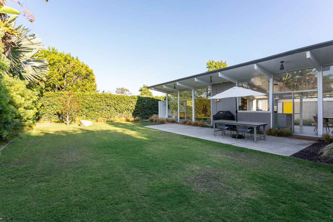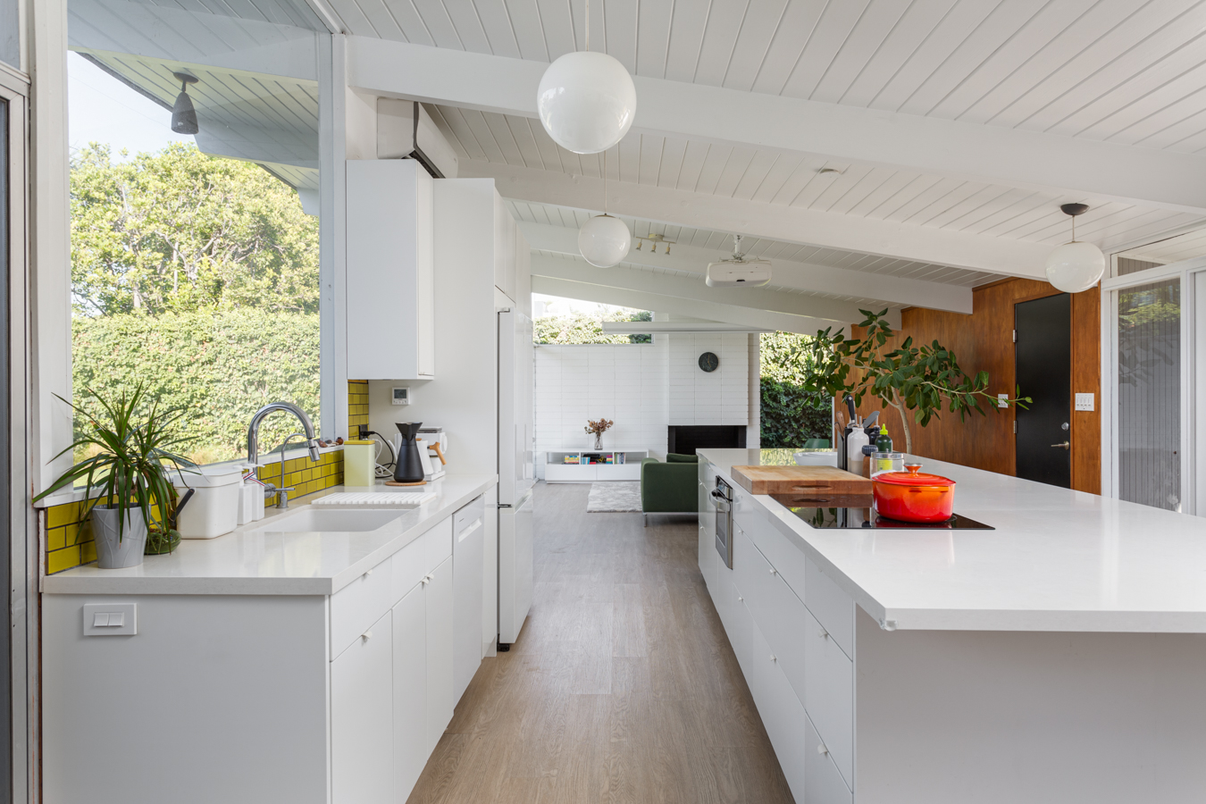 The master bedroom has two walk-in closets which seamlessly incorporates the third bedroom, providing a huge master suite with direct access to the sprawling back garden. With split systems throughout for efficient cooling and heating, rest assured you have year-round comfort. Before you ask; yes! the radiant heated floors is still accessible. Immediately notice the sleek LVT flooring throughout the entire open-plan living space, captivating high ceilings and beams, with a minimalistic feel of this professionally kept Eichler work of art. The kitchen now features custom cabinetry and new appliances, including a refrigerator and dishwasher. The bathroom showcases a distinctive fixed glass panel in original Eichler textured glass, adding a unique yet updated touch.