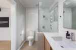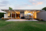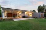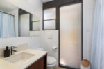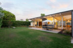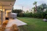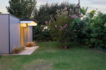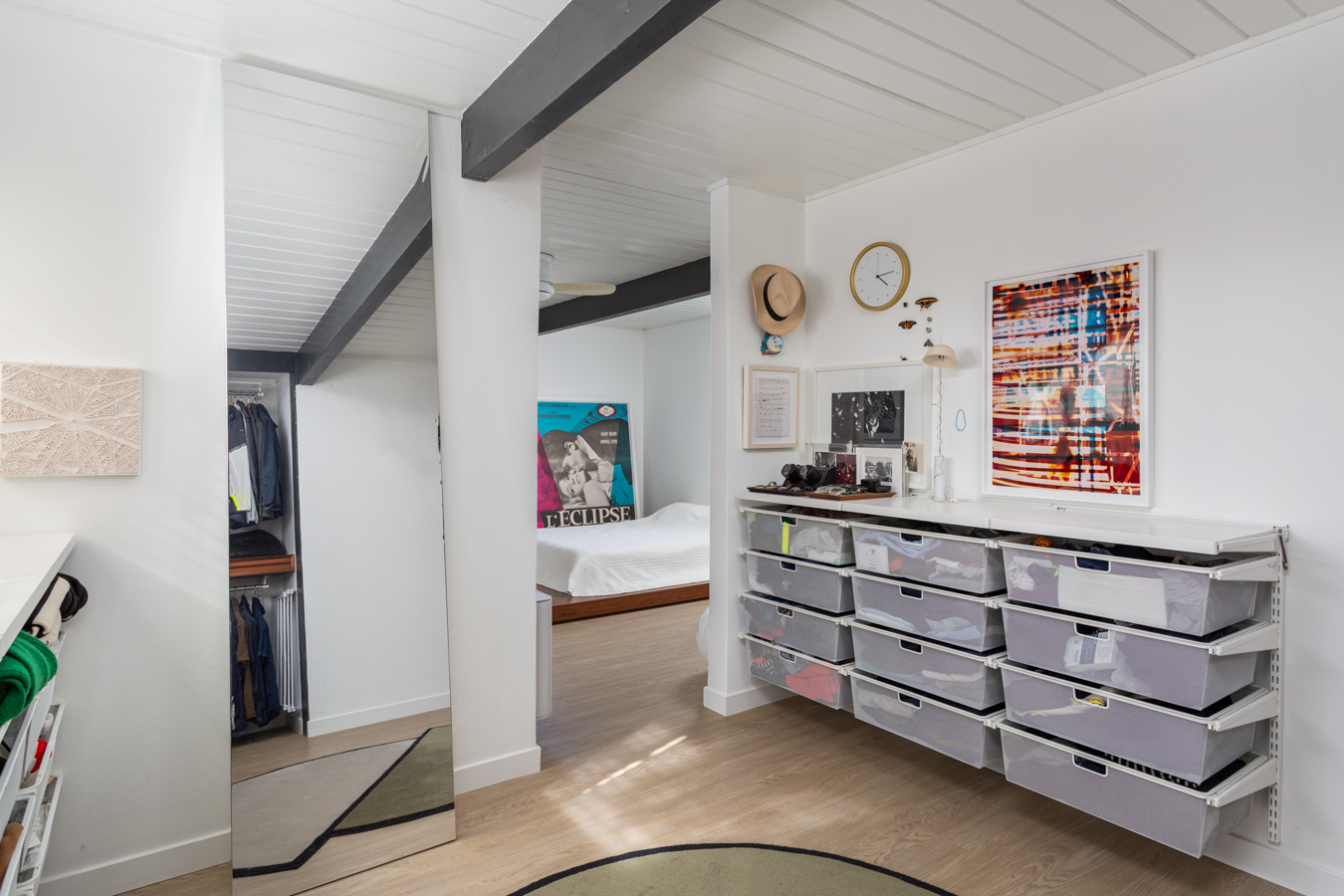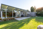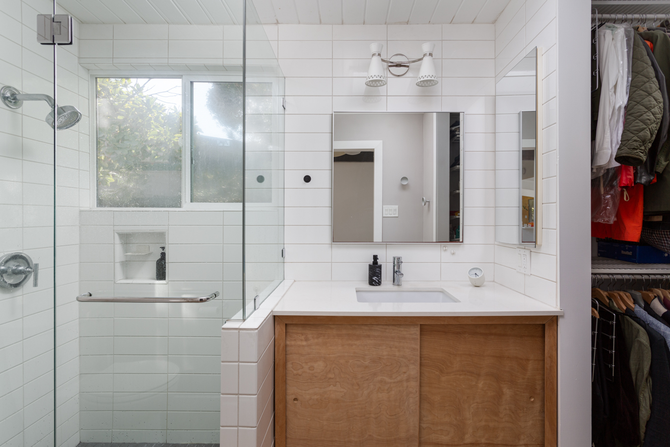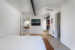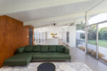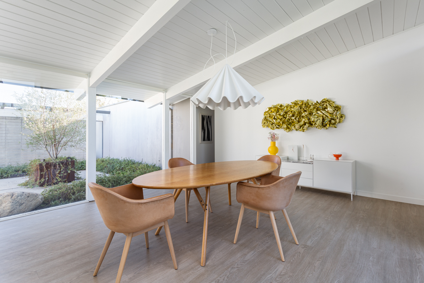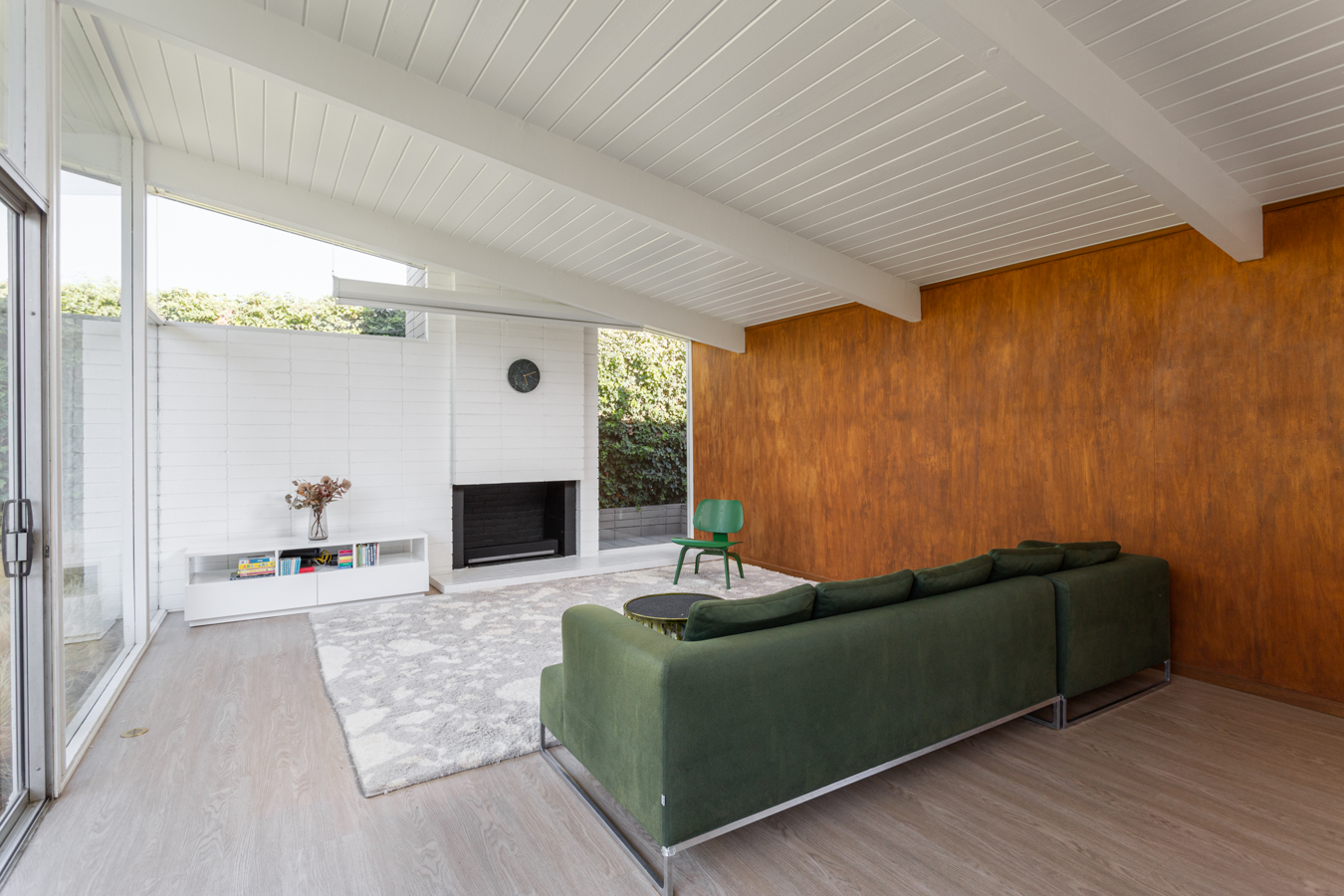 The master bedroom has two walk-in closets which seamlessly incorporates the third bedroom, providing a huge master suite with direct access to the sprawling back garden. With split systems throughout for efficient cooling and heating, rest assured you have year-round comfort. Before you ask; yes! the radiant heated floors is still accessible. Immediately notice the sleek LVT flooring throughout the entire open-plan living space, captivating high ceilings and beams, with a minimalistic feel of this professionally kept Eichler work of art. The kitchen now features custom cabinetry and new appliances, including a refrigerator and dishwasher. The bathroom showcases a distinctive fixed glass panel in original Eichler textured glass, adding a unique yet updated touch.