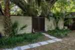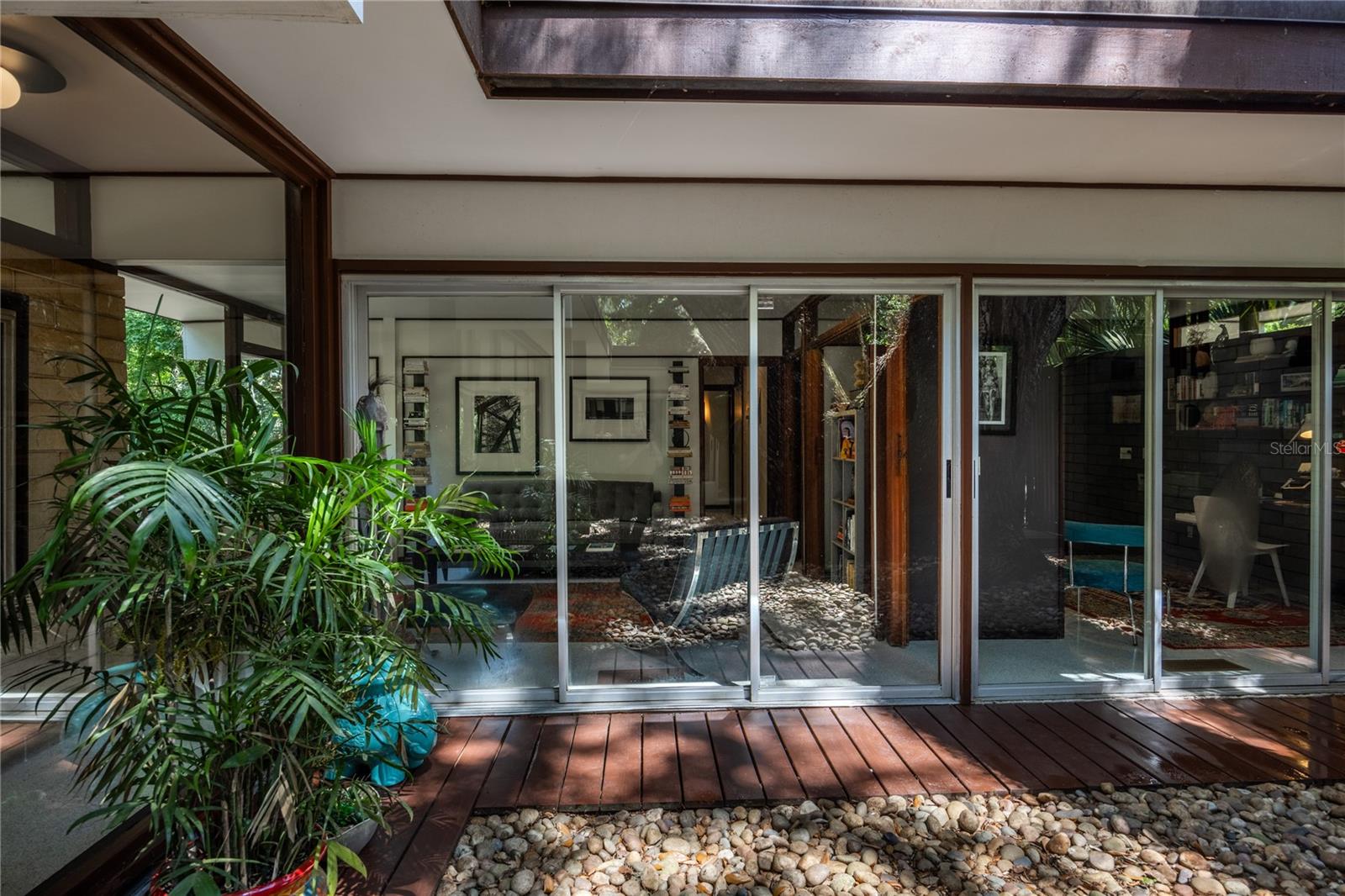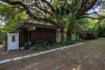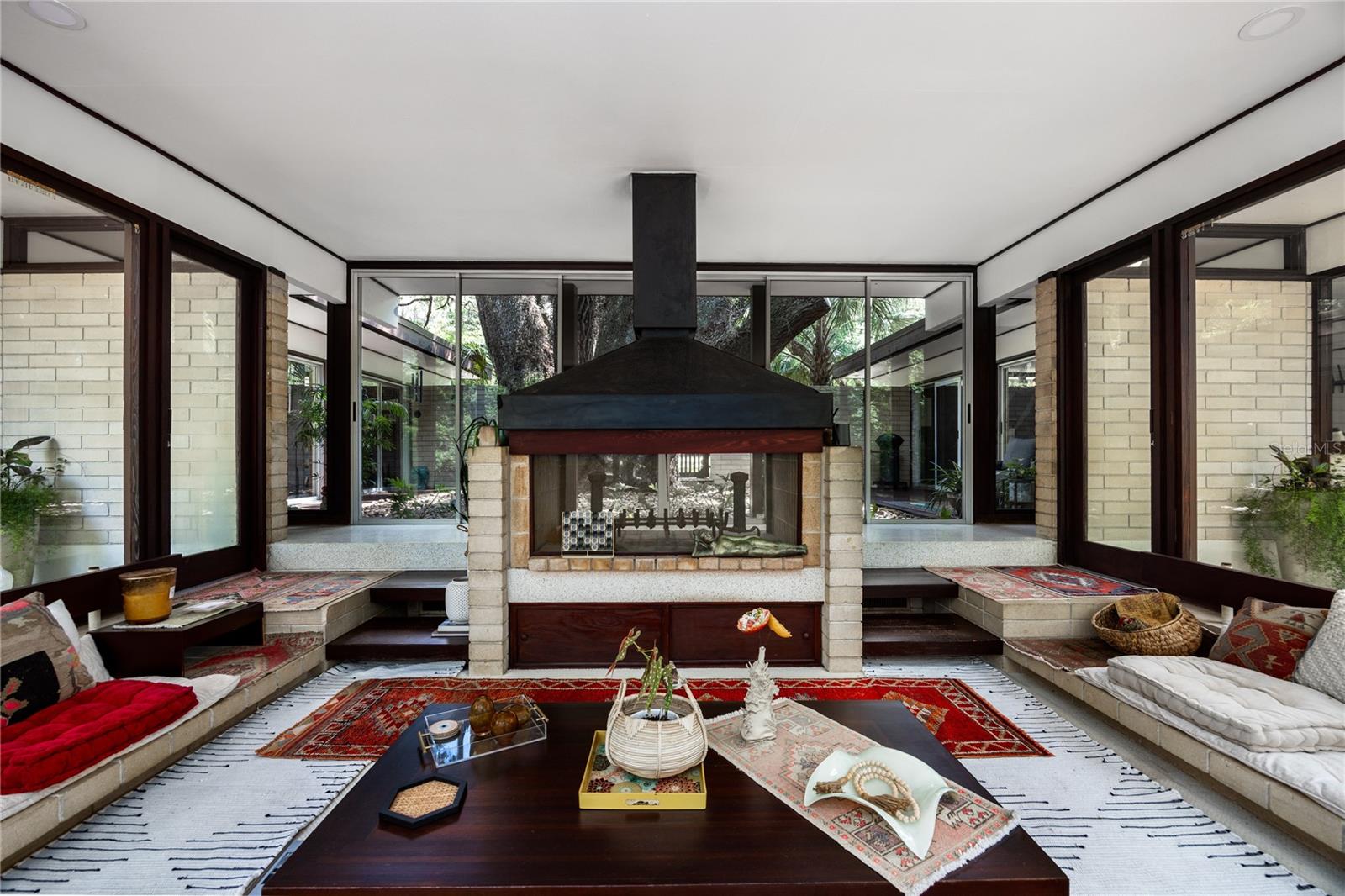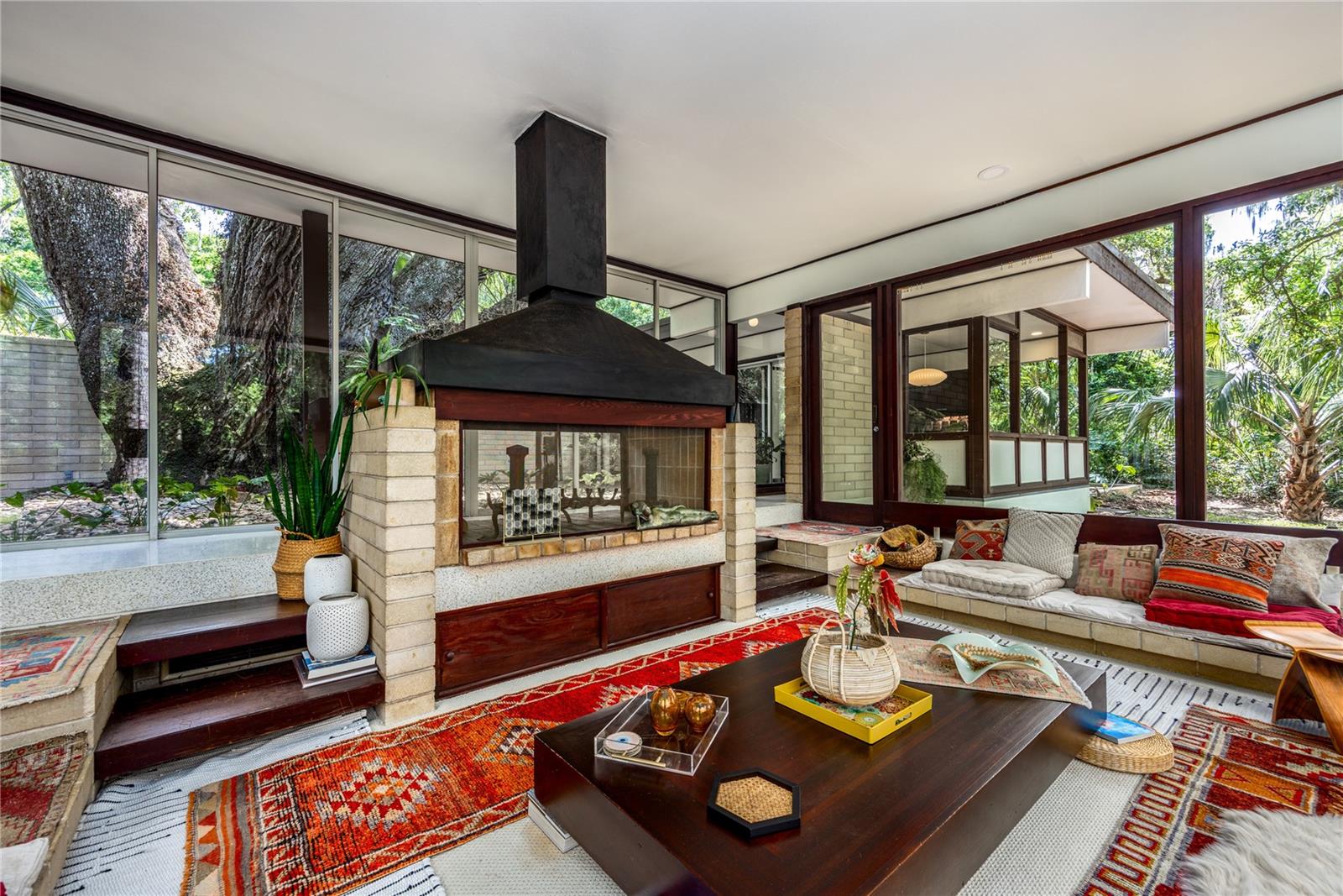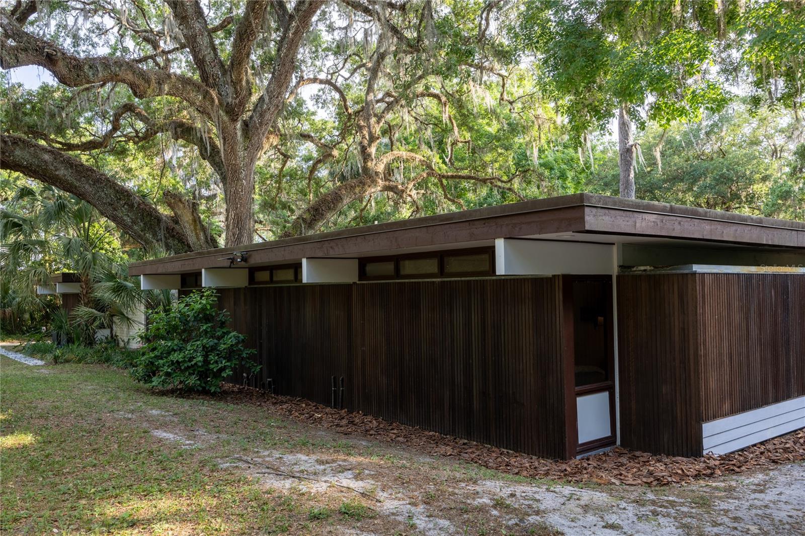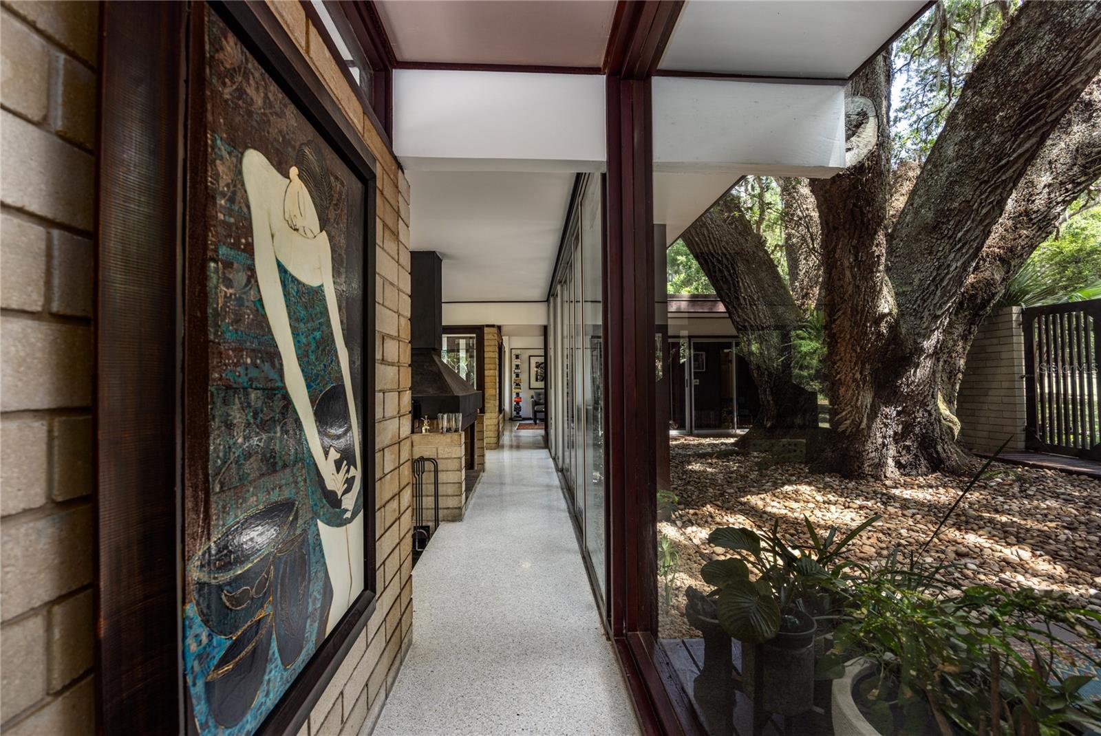 Extensive updates include a new commercial grade roof, repaired eaves, improvements to the plumbing and electrical systems, paint, wallpaper, and meticulously restored terrazzo floors. The home is centered on a 350-year-old Live Oak in the courtyard, which is visible from every living space through continuous glass walls. The courtyard’s deck and generous eaves create a dynamic outdoor living space that connects to the kitchen and dining rooms through a wall of sliding glass doors. The kitchen has been updated with stainless steel appliances, refinished wood cabinets, center island with breakfast bar and two pantries. Off the kitchen is the dining room with a George Nelson Bubble chandelier, recessed built-in buffet and large windows overlooking the expansive backyard. Around the corner is the dramatic sunken living room with wood burning fireplace and custom metal hood. This space features signature elements of Merritt’s designs: its lofty height, Ocala block built-in seating and fireplace mantle, and walls of glass offering panoramic views. Around the corner is the more intimate family room with built-in seating (featuring hidden storage), windows to the backyard and another set of sliding glass doors to the courtyard. A hallway leads to an updated, full guest bathroom and two guest bedrooms with walls of windows overlooking the rear garden. At the end of the hall is the large primary suite. This room has a built-in vanity with a wall of shelves. All the bedrooms have custom closet systems by California Closets. The primary bedroom has another Merritt signature feature, a wall of Redwood siding and clerestory windows. The Primary Suite includes an en suite bathroom with an updated shower with seamless glass enclosure, vanity with new sink. Both the primary bathroom and the family room connect to an intimate office with another wall of Redwood siding, built-in desk and flexible storage space. There are two septic systems and a well with a water purification system.