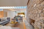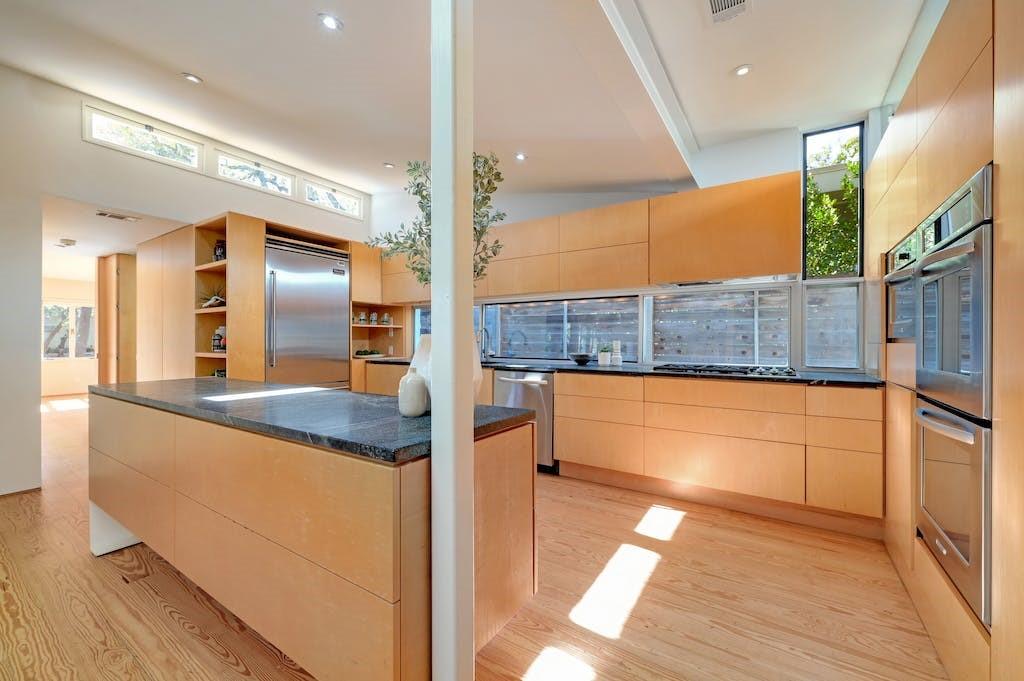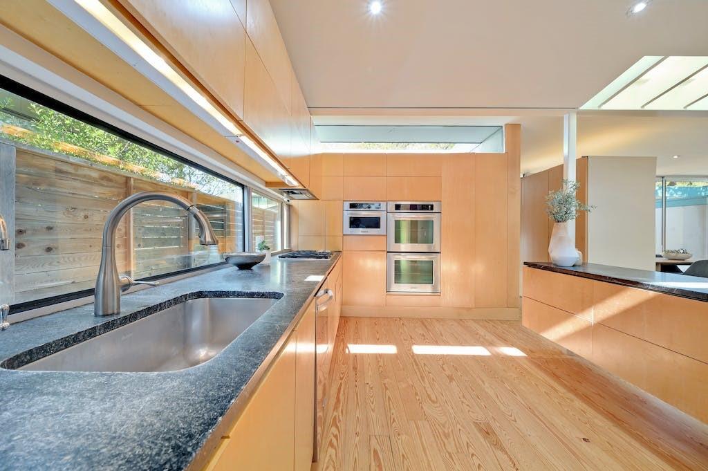 Originally built in 1950, this home retains the original lines and low profile exterior and features signature AD Stenger clerestory windows and stone fireplace. In 2009, MJ Neal remodeled the entire home with a modern twist. The project featured an open gourmet kitchen with soapstone counters and Viking appliances, custom maple cabinetry and paneling to compliment the pine floors, walls of glass opening to a central atrium, updated baths including a primary glass shower overlooking a private side atrium and a massive central skylight that floods the interior with natural light.