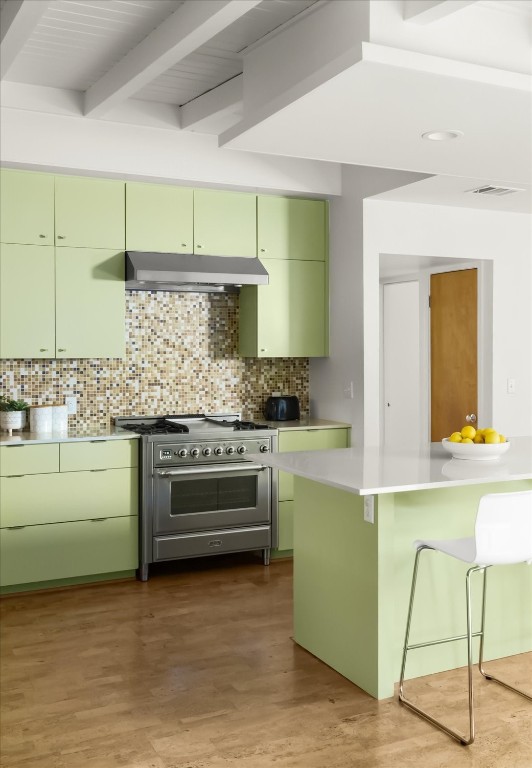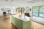 One of Stenger’s approximately 100 distinct creations, it showcases many of his signature features: Clerestory windows, beamed ceilings, and sustainable materials.