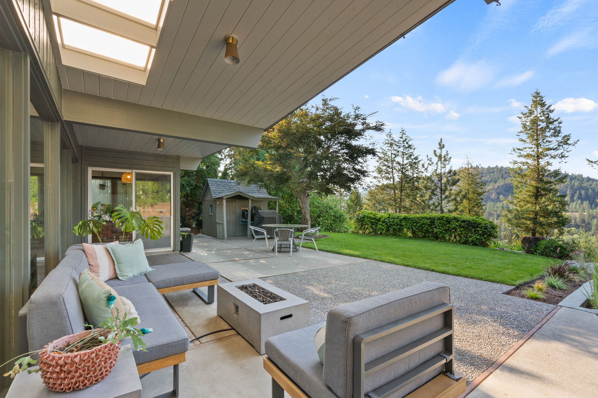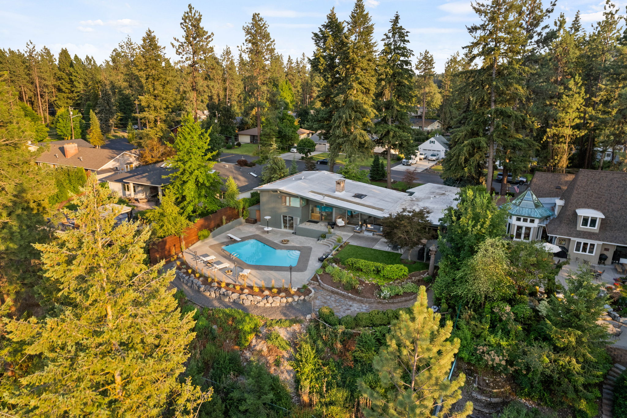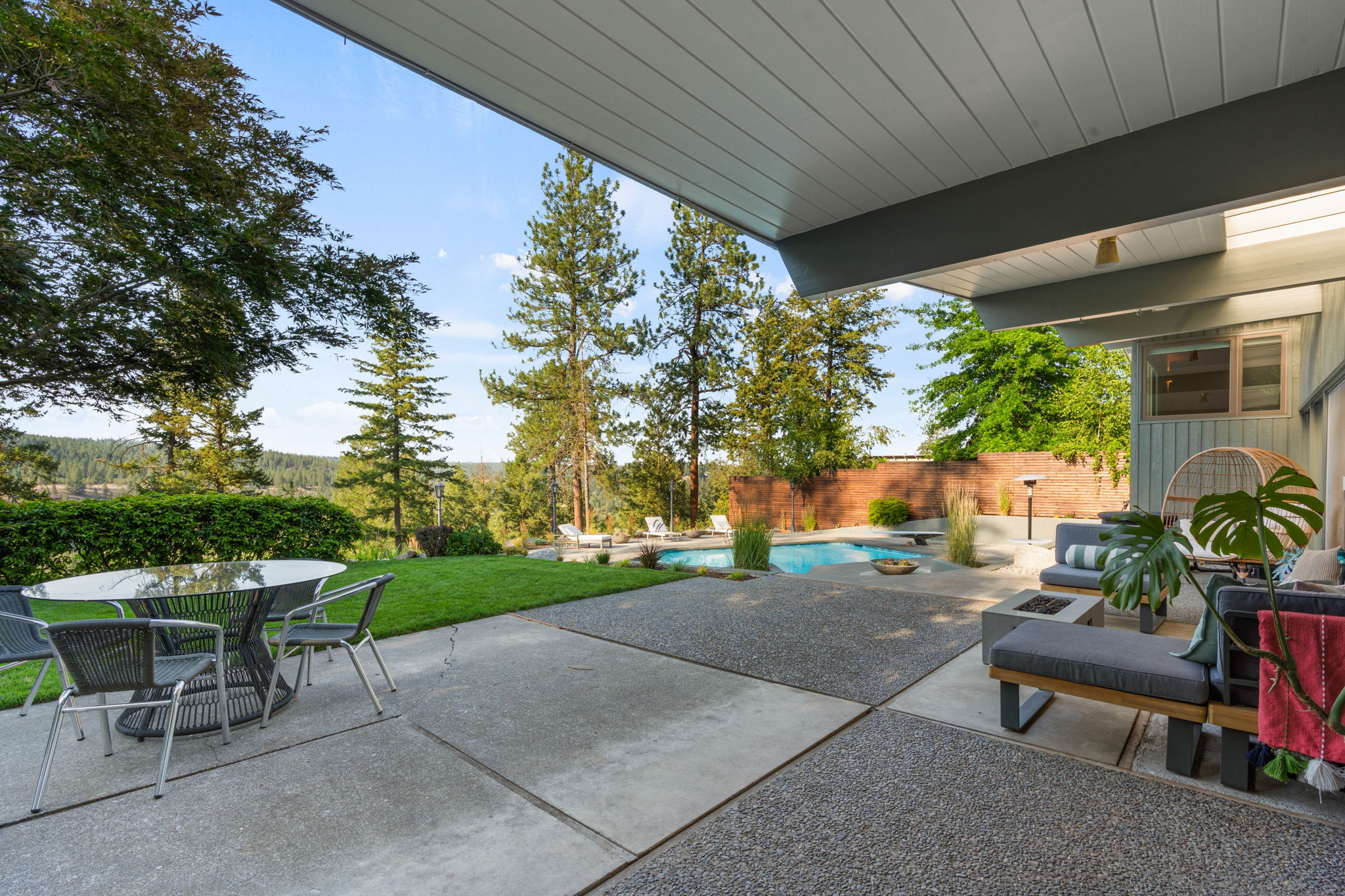 A covered patio offers a serene setting with views of the saltwater pool and the expansive Kalispel Country Club Golf Course. With generously sized bedrooms and a spacious basement bonus room, this home provides ample space for both family and guests. Located in a secluded area with sweeping views of the fairways below, you’ll experience privacy and tranquility while remaining close to Spokane’s vibrant amenities. Ride your own golf cart along the private back entrance of the country club for your dinner reservation or tee time. Additional features include a modern kitchen with updated appliances, a 60-foot wall of floor-to-ceiling windows that flood the interior with natural light, and mature landscaping that transforms the backyard into a private resort. This mid-century gem offers a rare opportunity to own a piece of Atomic Rancher history in one of Spokane’s most sought-after neighborhoods.